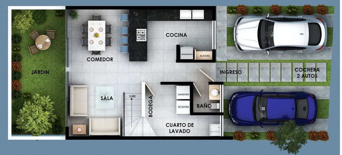 - Diseño moderno con acabados visibles en cocina y escaleras.