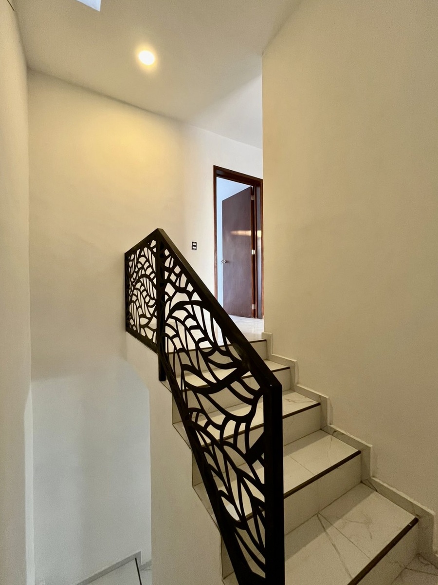 En planta baja cuenta con cochera para 2 autos, sala, comedor, cocina integral con cubiertas de piedra sinterizada, alacena, medio baño, covacha para herramientas, patio de servicio y jardín. En planta alta 2 recámaras secundarias, 1 baño completo y 1 recámara principal con baño completo, "walking closet" y balcón.