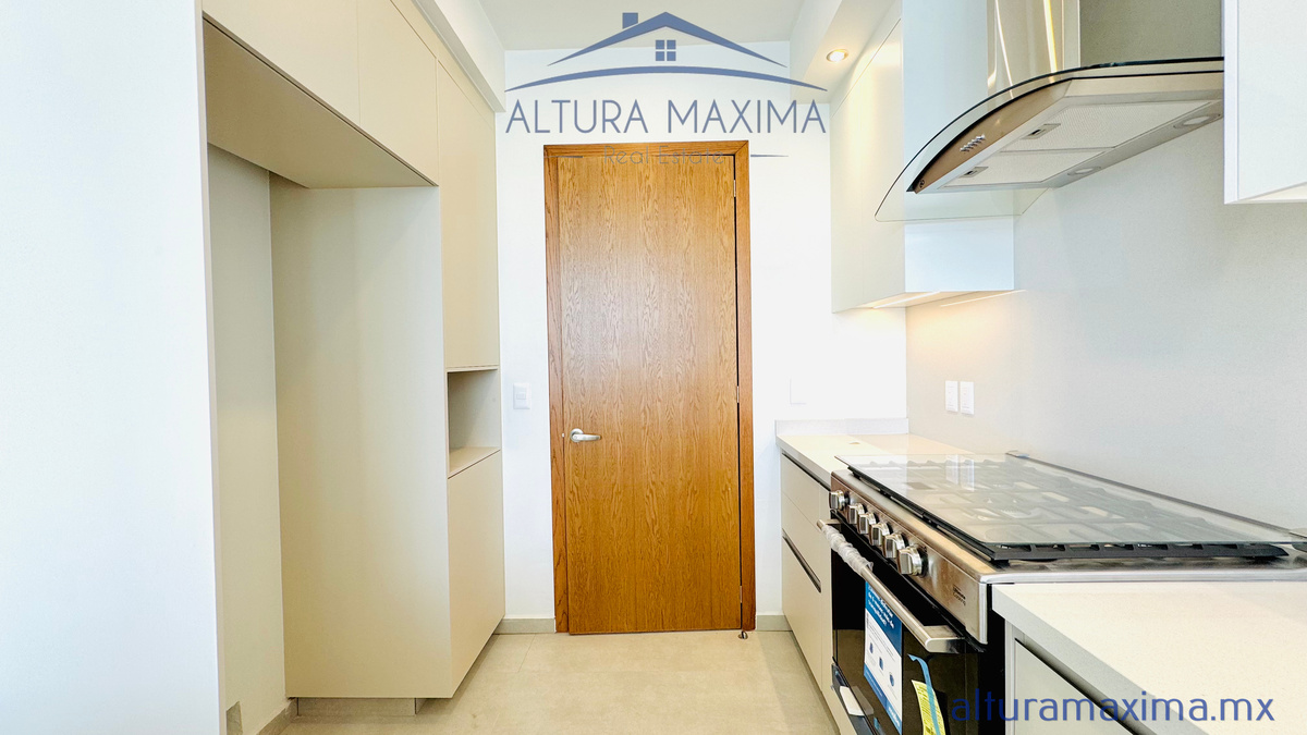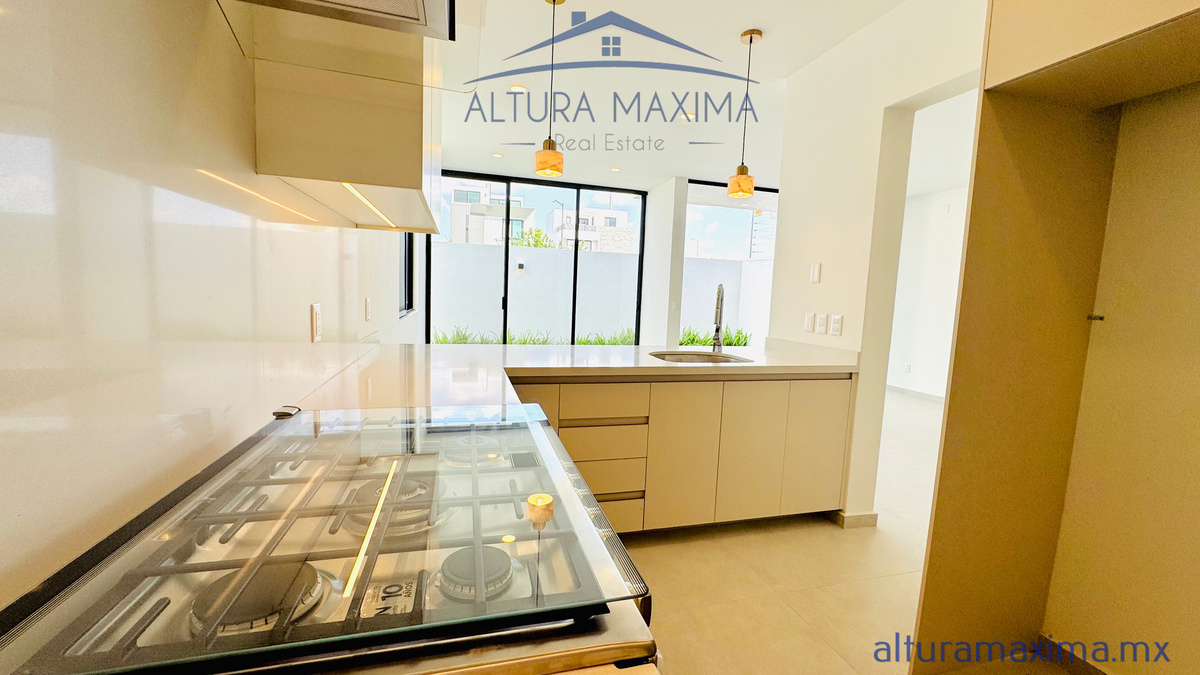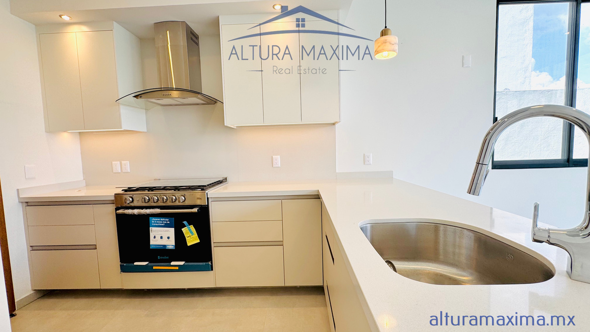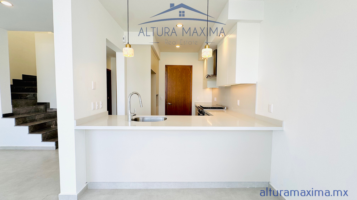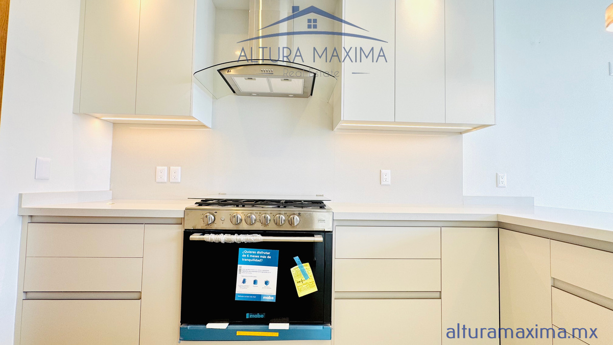 -Cocina integral totalmente equipada, cubierta de cuarzo blanco, doble tarja, hornos, parrilla mabe de gas.