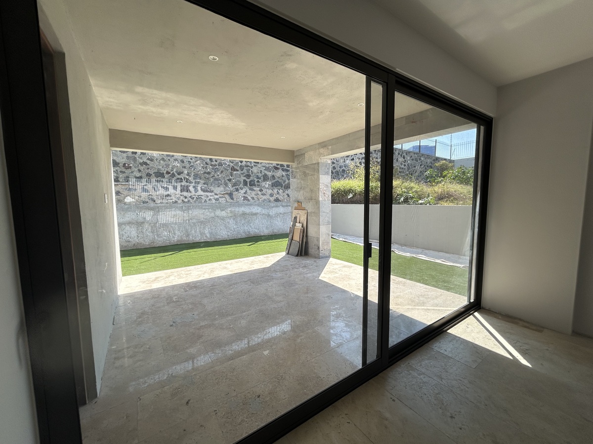 Ventanal corredizo que abre hacia una amplia terraza techada con acceso y vista al jardín mucha privacidad.