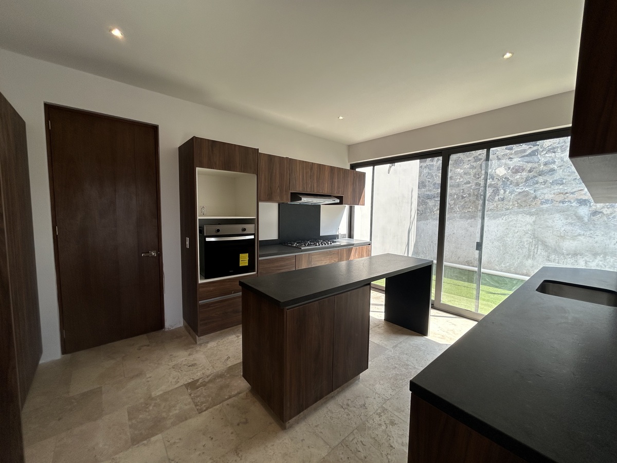 Cocina independiente con su barra para bancos, con acceso a la terraza y con ventanales corredizos hacia el jardín trasero. .