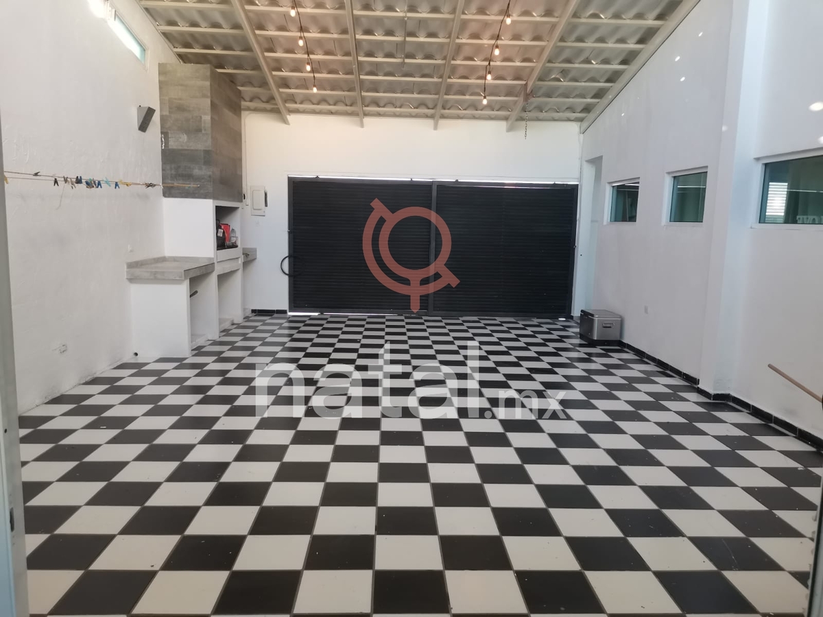 • Cocina integral con encimera de concreto, muebles de almacenamiento (gabinetes superiores e inferiores) parrilla de gas con 6 quemadores y campana, tarja de una tina grande de color blanco y mezcladora alta, cuenta con un lugar para el almacenamiento de la comida y puerta de granero corrediza, puerta francesa corrediza la cual da al pasillo