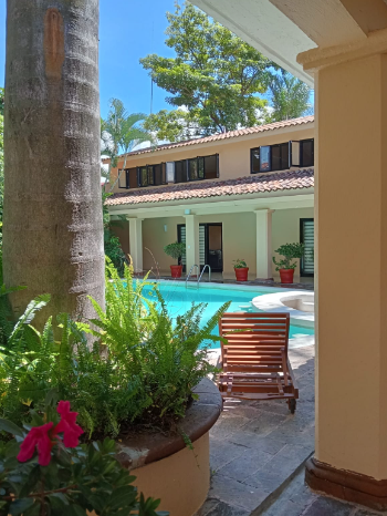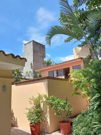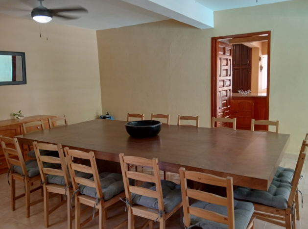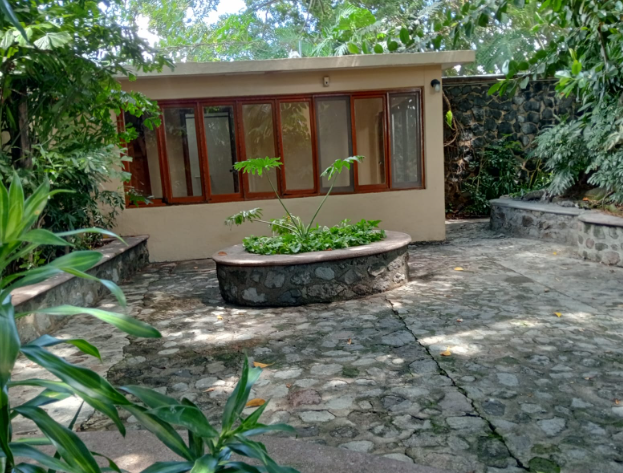 La casa principal (475 m²) cuenta con amplias áreas sociales, sala con vista al jardín, comedor, cocina integral con detalles en madera, terraza techada y un área de alberca con bar integrado, ideal para la convivencia familiar. El amplio jardín está recorrido por un apantle tradicional, canal histórico que transporta agua pura y cristalina, rodeado de vegetación tropical y árboles maduros que aportan frescura durante todo el año.