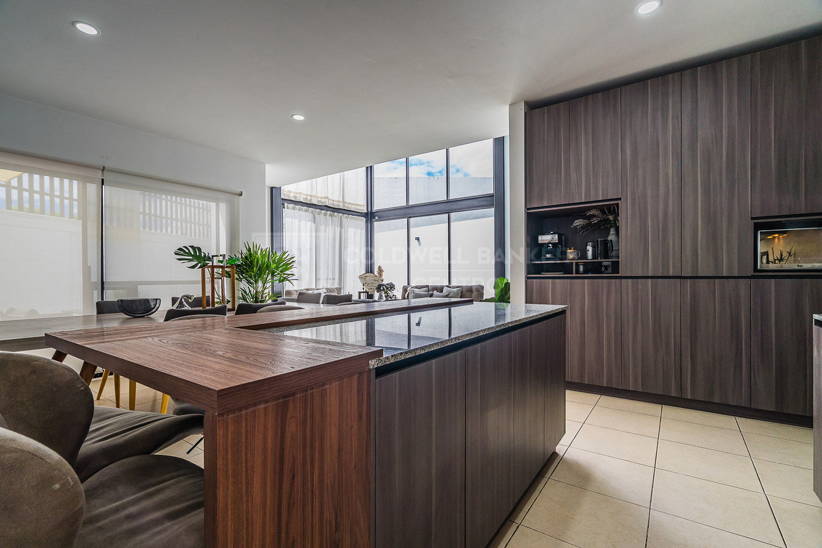 Al ingresar, bajas un nivel y te recibe una sala de doble altura con espectacular iluminación natural que crea un ambiente cálido y sofisticado. En esta planta se encuentran el baño de visitas, comedor, cocina abierta equipada, área de lavado, cuarto de servicio y un jardín privado, ideal para convivir o relajarte.