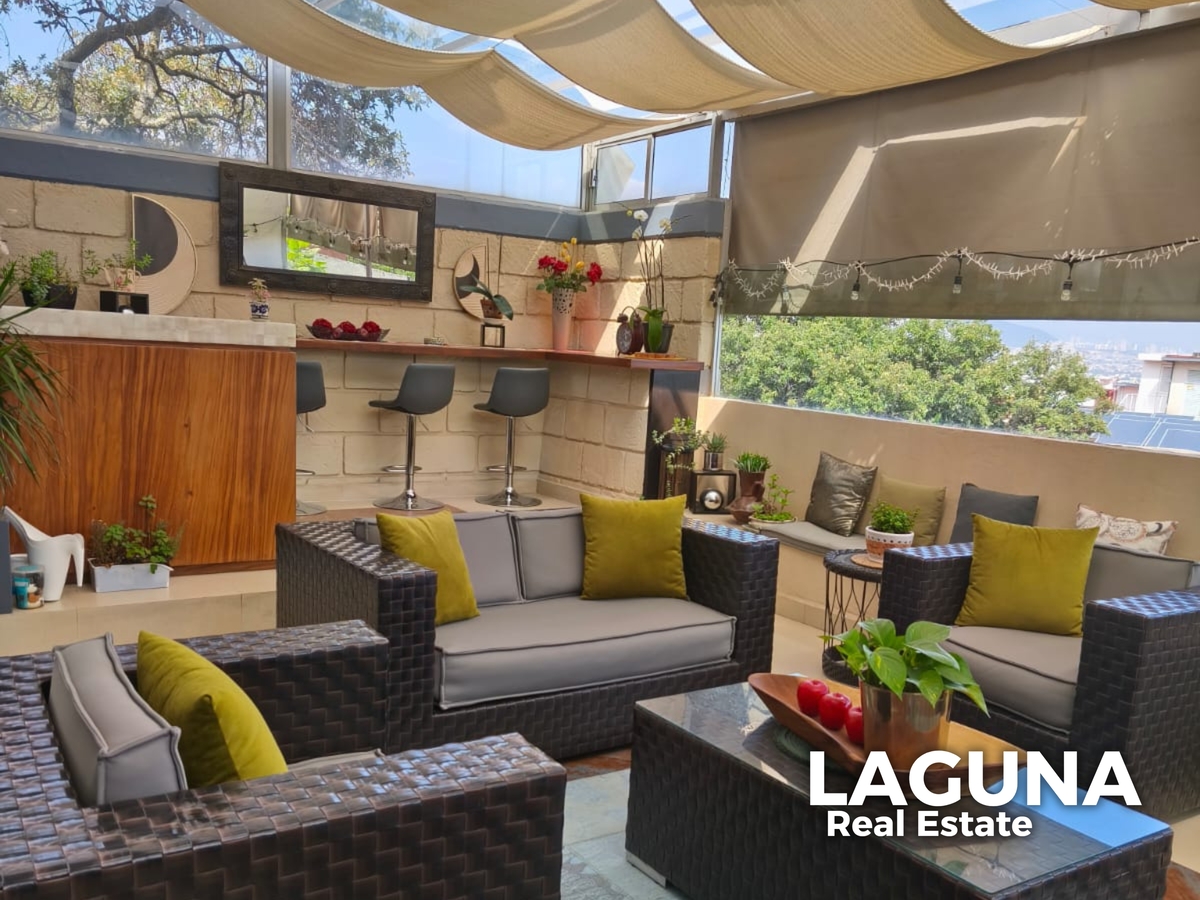 La planta baja se conforma por el acceso a recibidor con un medio baño, un comedor y una cocina con una iluminación natural que te encantará. Y si lo tuyo son las reuniones sociales, tiene una terraza magnífica con un área de bar!