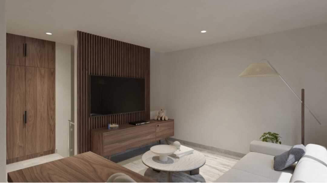 Planta alta: Habitación principal con baño y vestidor, habitación secundaria con closet y baño, sala de TV, closet de blancos