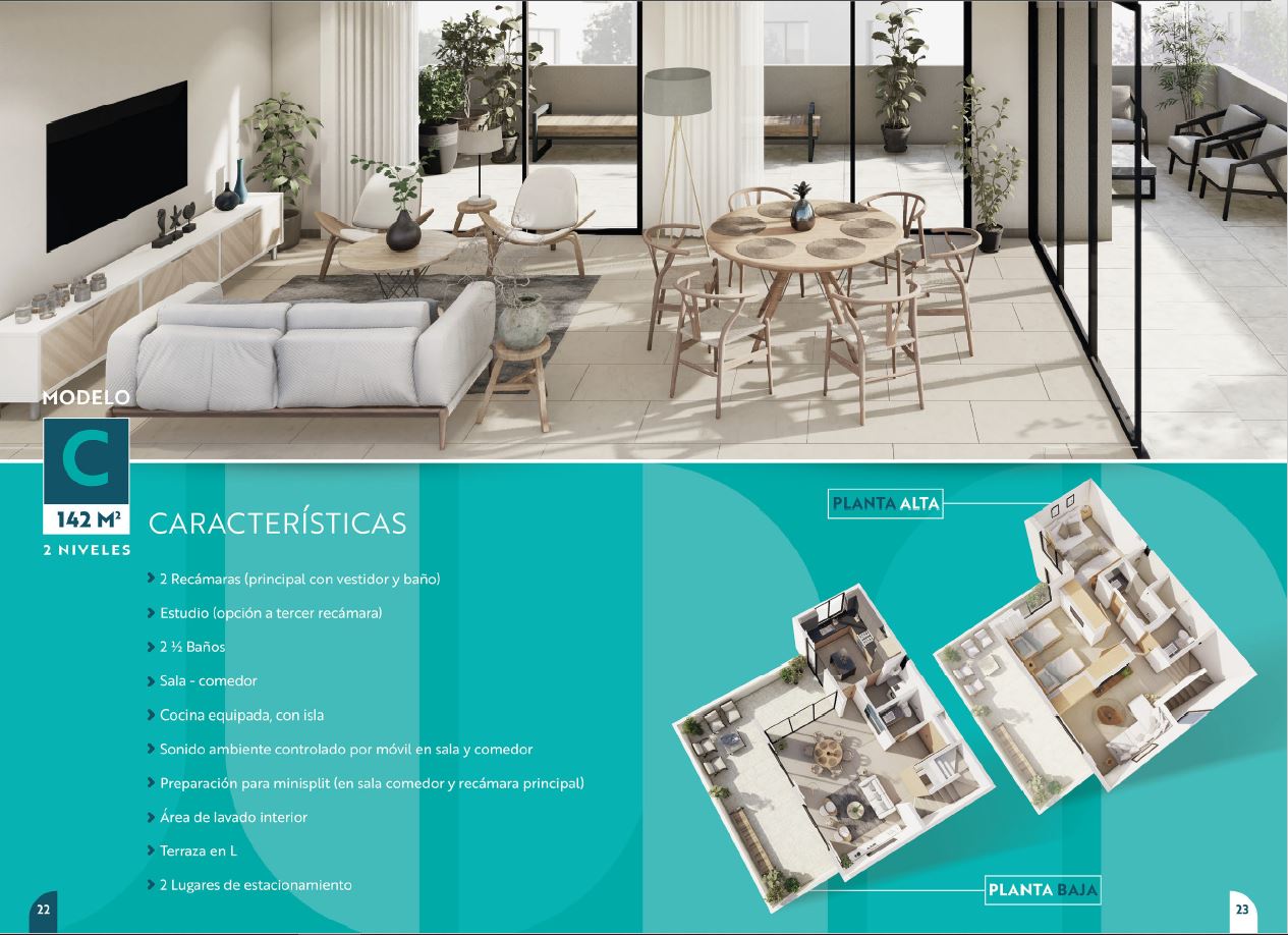 Depa en venta Amaia Modelo "C" Altos de Juriquilla. 142.97 m2 de Construcción. Dos Recámaras (principal con Vestidor y Baño) Estudio (opción 3a Recámara. 2.5 Baños. Sala-Comedor. Cocina Equipada con Isla. Preparación para minisplit (en la Sala-Comedor y Recámara Principal) Área de Lavado Interior. Sonido Ambiente controlado por móvil, Enorme Terraza en "L" Techada. 2 Lugares de Estacionamiento.