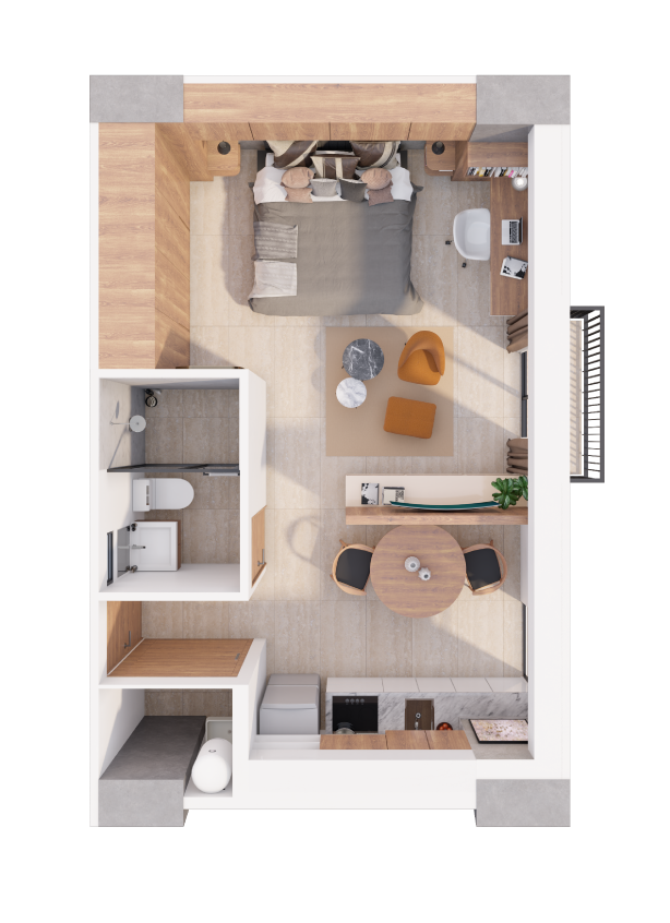 Cocina, Sala, Dormitorio, Balcón, 1 baño, Escritorio, Area de lavado.