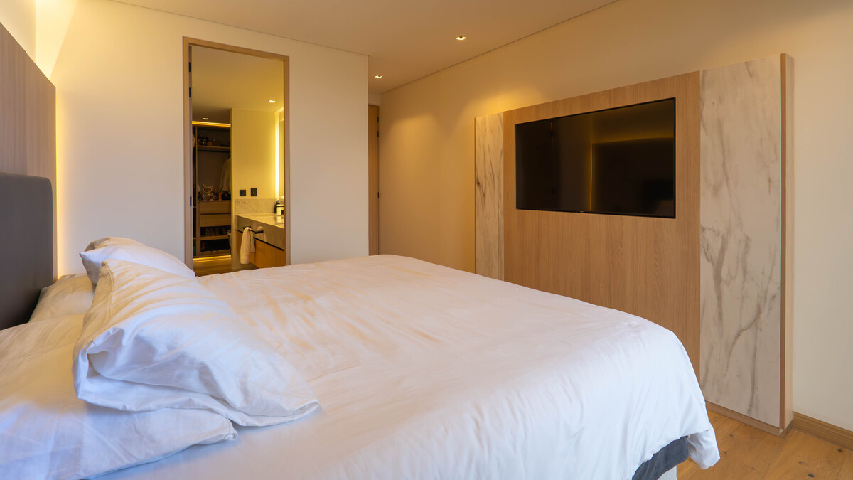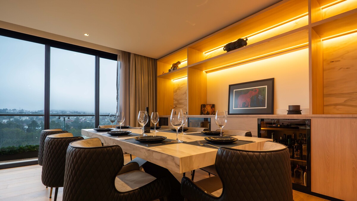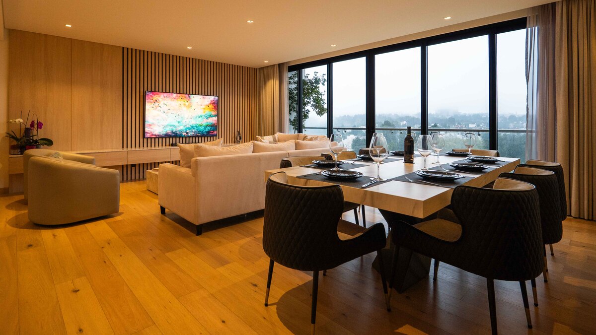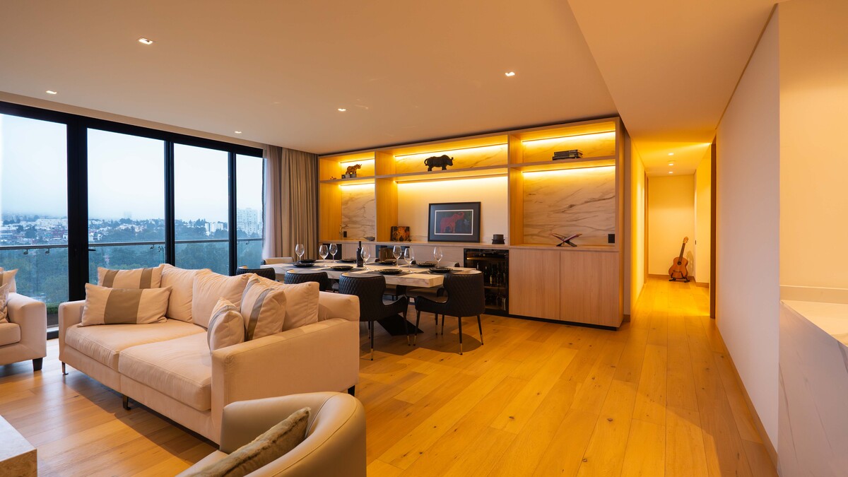 Este departamento de 155 m² (137.5 m² interiores y 17.5 m² de balcón), completamente amueblado con mobiliario hecho a la medida por un proyecto de interiorismo, ofrece un espacio generoso en su zona social integrada por cocina, sala y comedor. Cuenta con 2 recámaras y 2.5 baños, además de vistas espectaculares a las montañas que enmarcan cada día con serenidad y belleza. Cada detalle está pensado para quienes buscan exclusividad, diseño y una calidad de vida perdurable en el corazón de Santa Fe.