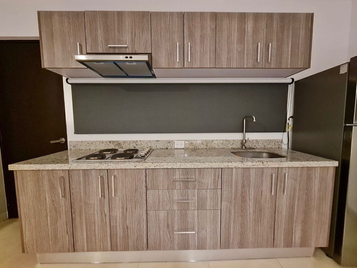 En la cocina: refrigerador, parrilla eléctrica, campana extractora y calentador de agua eléctrico.