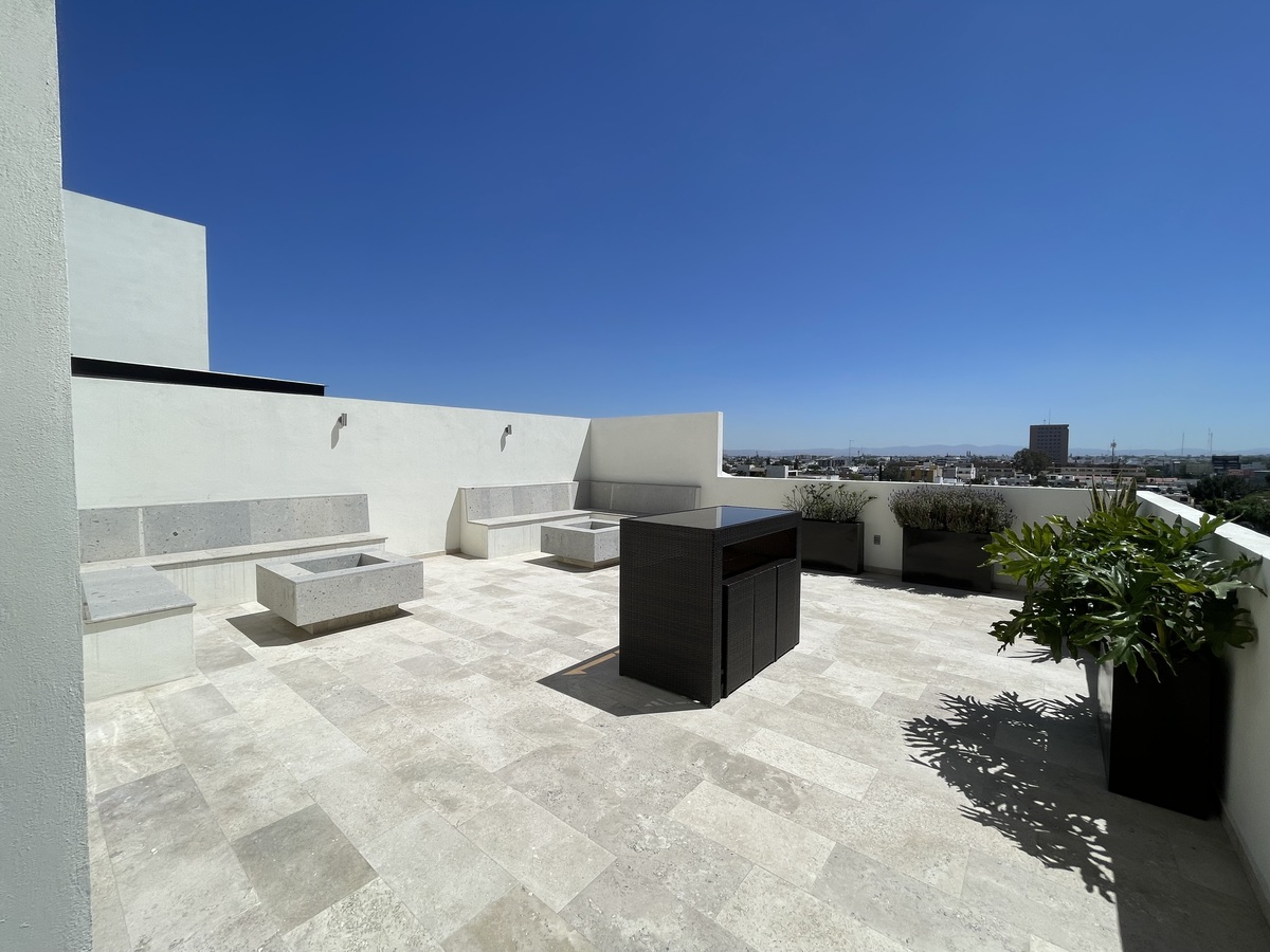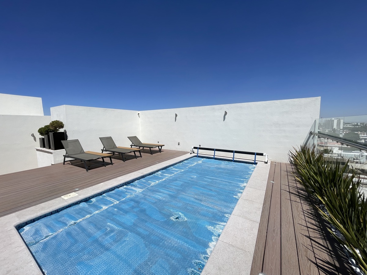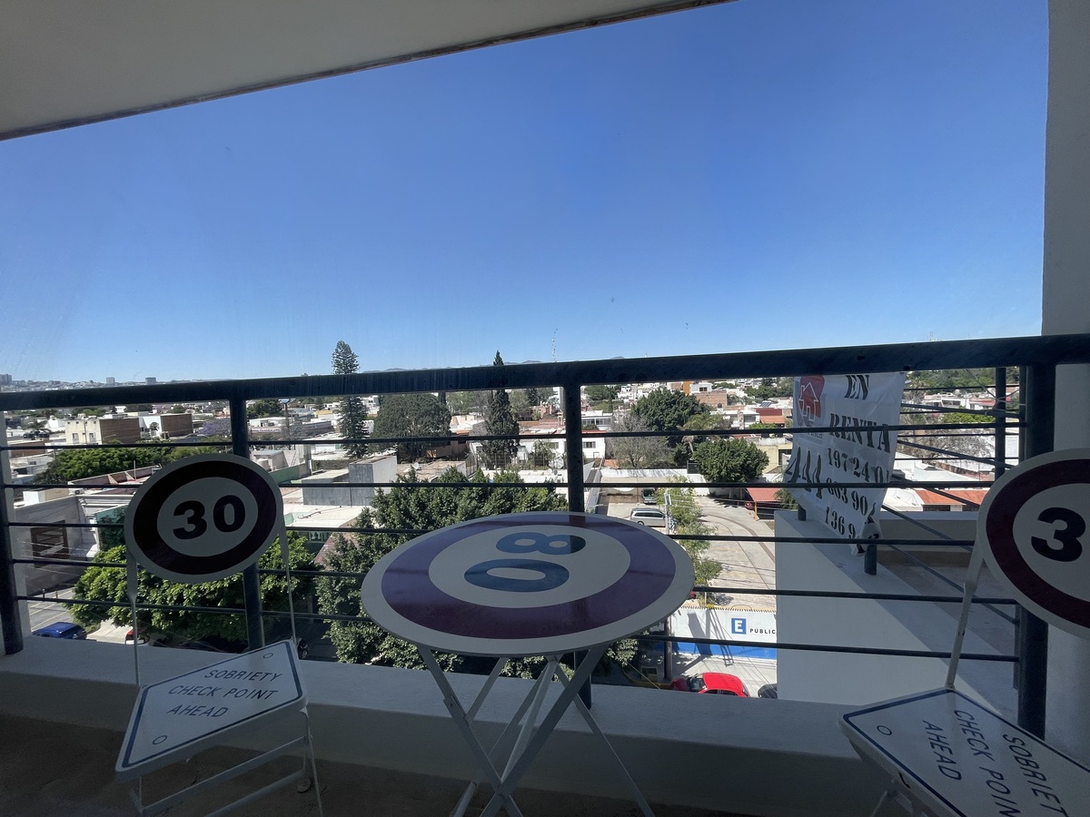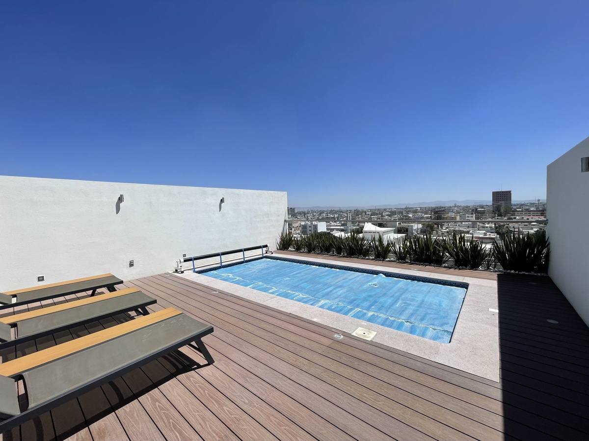 Departamento Loft amueblado, en zona muy céntrica, cerca de las principales arterias viales de la ciudad, sala, comedor, cocina a espacio abierto, medio baño de visitas ,área de lavado, 1 recámara con vestidor, baño balcón, estacionamiento 2 autos. edificio con seguridad 24 hrs, control de acceso facial y huella, elevador, amenidades, gym, salón de usos múltiples con villar, alberca , fogateros, área de juegos infantiles, terraza, área grill, petanca, salón de juegos,