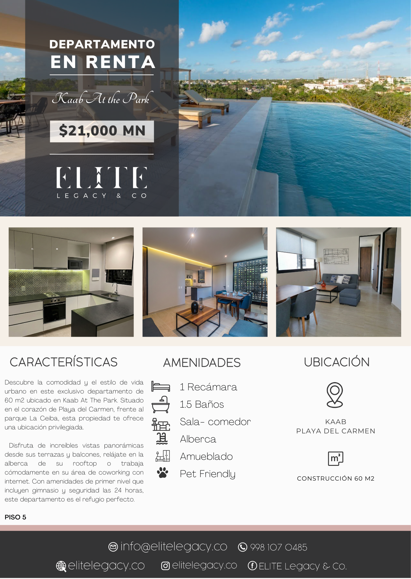Descubre la comodidad y el estilo de vida urbano en este exclusivo departamento de 60 m2 ubicado en Kaab At The Park. Situado en el corazón de Playa del Carmen, frente al parque La Ceiba, esta propiedad te ofrece una ubicación privilegiada. Disfruta de increíbles vistas panorámicas desde sus terrazas y balcones, relájate en la alberca de su rooftop o trabaja cómodamente en su área de coworking con internet. Con amenidades de primer nivel que incluyen gimnasio y seguridad las 24 horas, este departamento es el refugio perfecto.