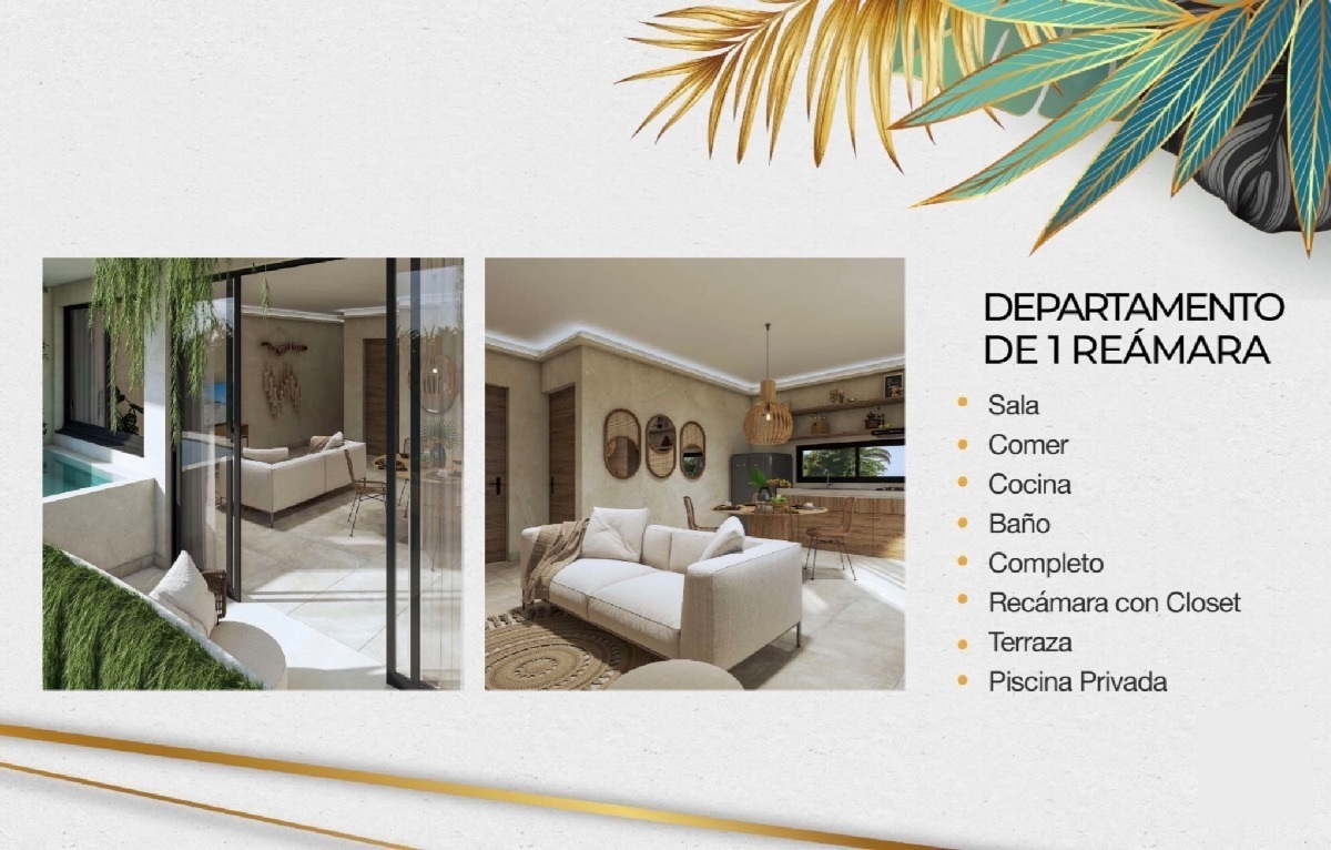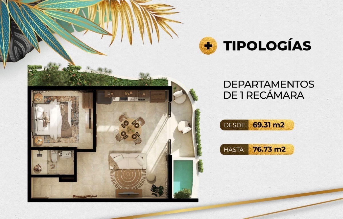 Contamos con tipologías estudio, de 1 y 2 recámaras con baño, desde 38.44m2 hasta 76.73m2, en diferentes formatos, *totalmente equipados, bajo esquemas desde el 50% de enganche se entregan amueblados y decorados, con llave en mano.
