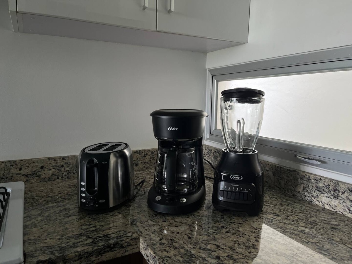 Cocina equipada con barra desayunadora, estufa y campana