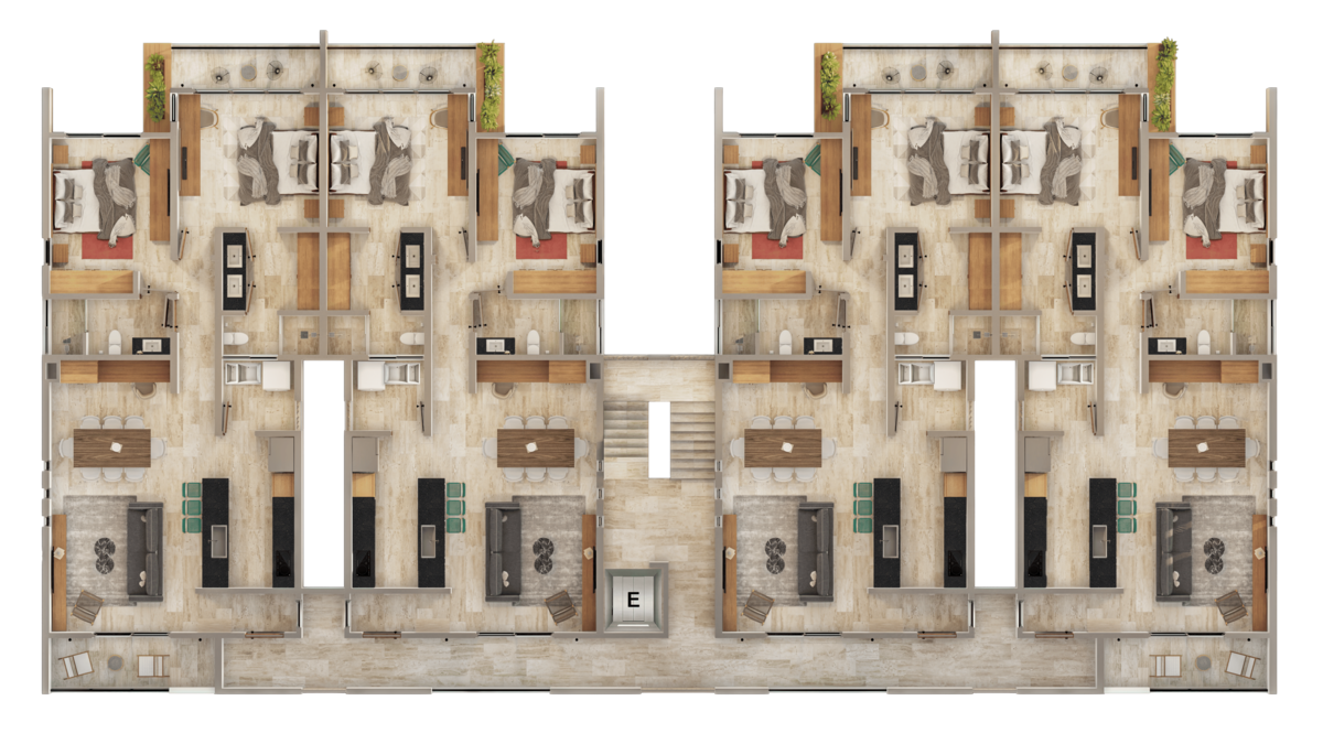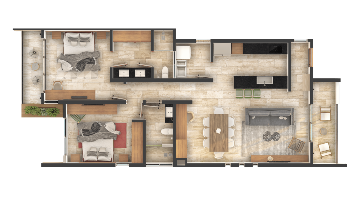 MODELO PRIME/ 2 RECÁMARAS/ 104.24 MT2/ TERRAZA 6.54 MT2/ CAJÓN 12.50 MT2