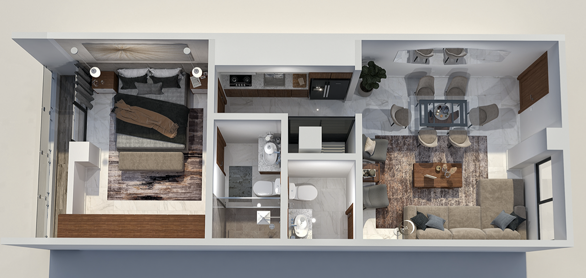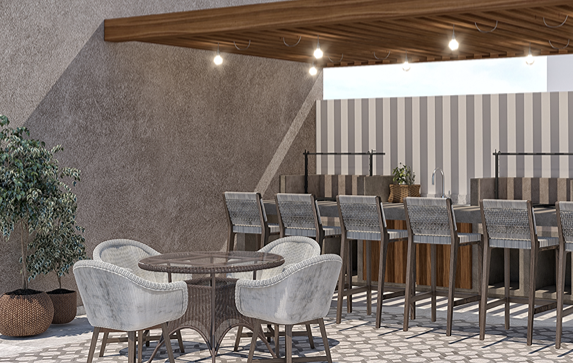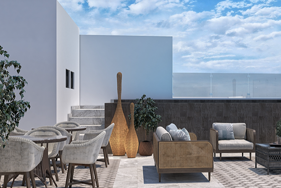 63 departamentos de 1 y 2 recámaras distribuidos en 7 niveles y con amenidades de primer nivel como sala de juntas, oficina administrativa, caseta de seguridad, recepción, elevadores, Roof Garden con piscina tipo jacuzzi, área social, asadores, gimnasio, área de masajes, área de juegos, área funcional y Sky Bar.