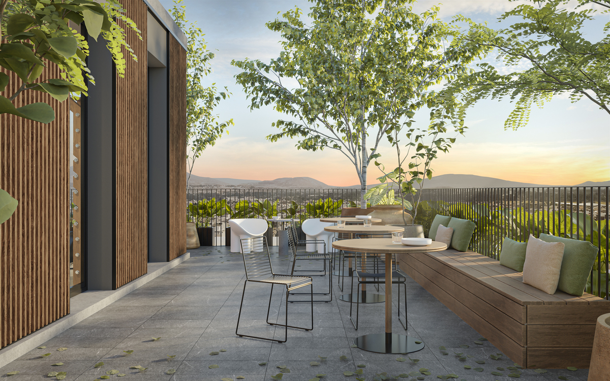El edificio destaca por su fachada dinámica con celosías móviles, rooftop panorámico con amenidades como Sky Lounge, Gym acústico, Rooftop Grill, Zona Zen, Pet Shower, Tool Room y más.