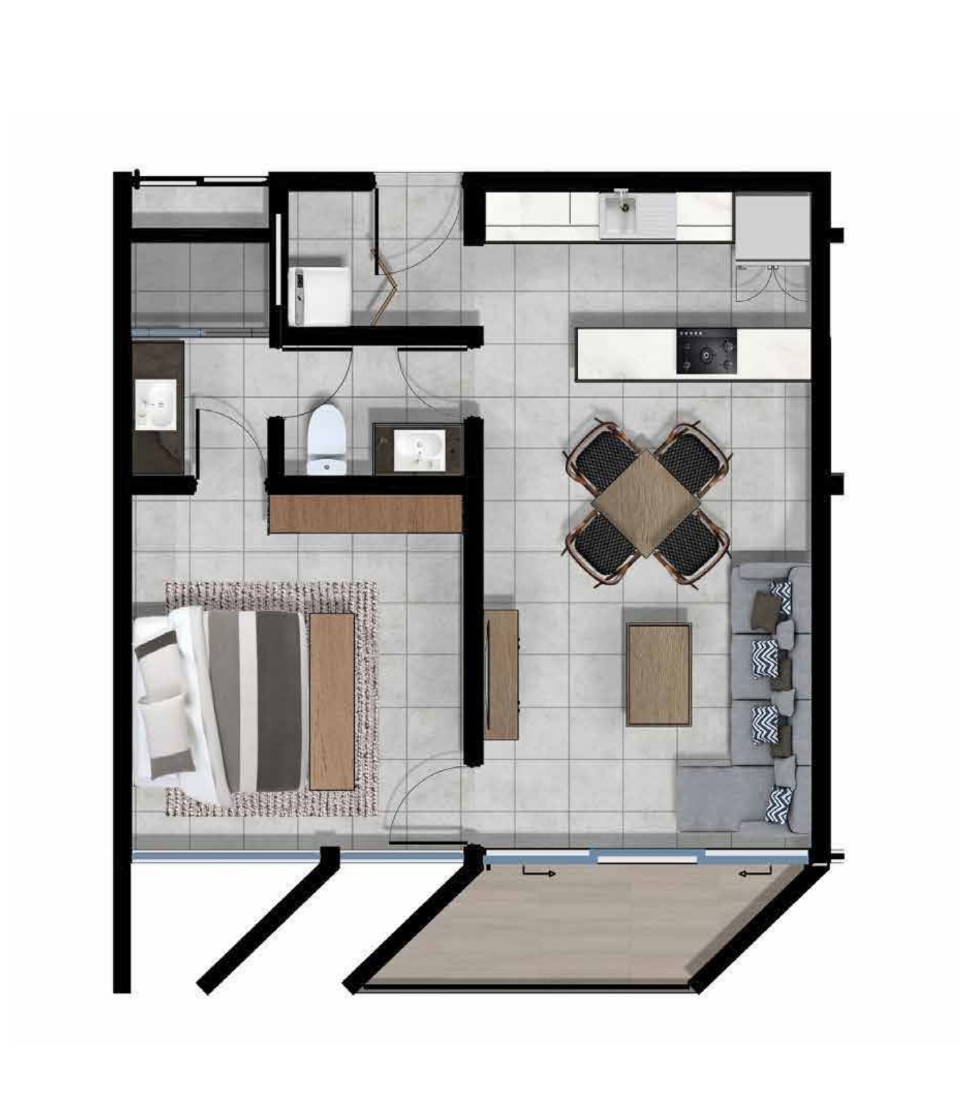 -Una recámara con clóset lineal, ventilador de techo, aire acondicionado inverter y persianas blackout.