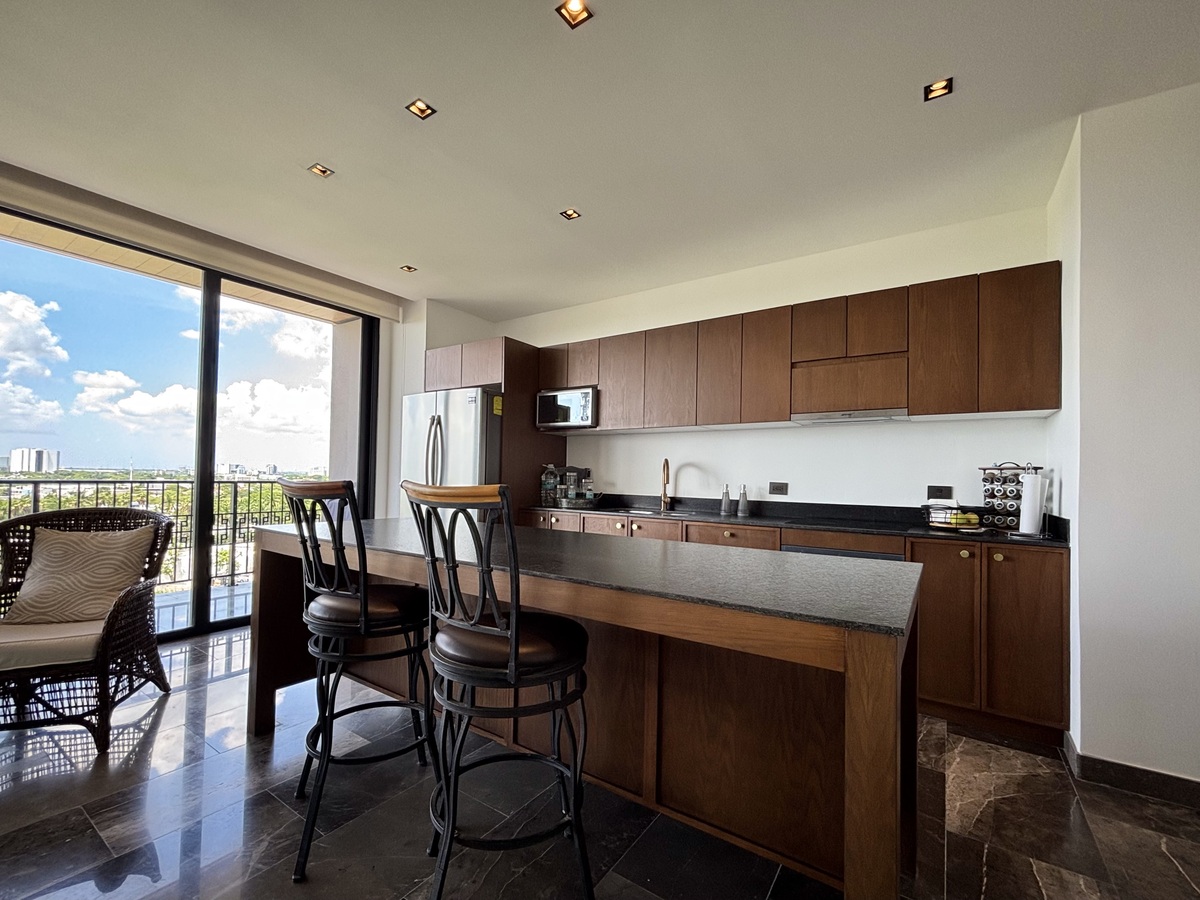 Cocina con isla, horno, parrilla eléctrica, campana, refrigerador de tres puertas y microondas