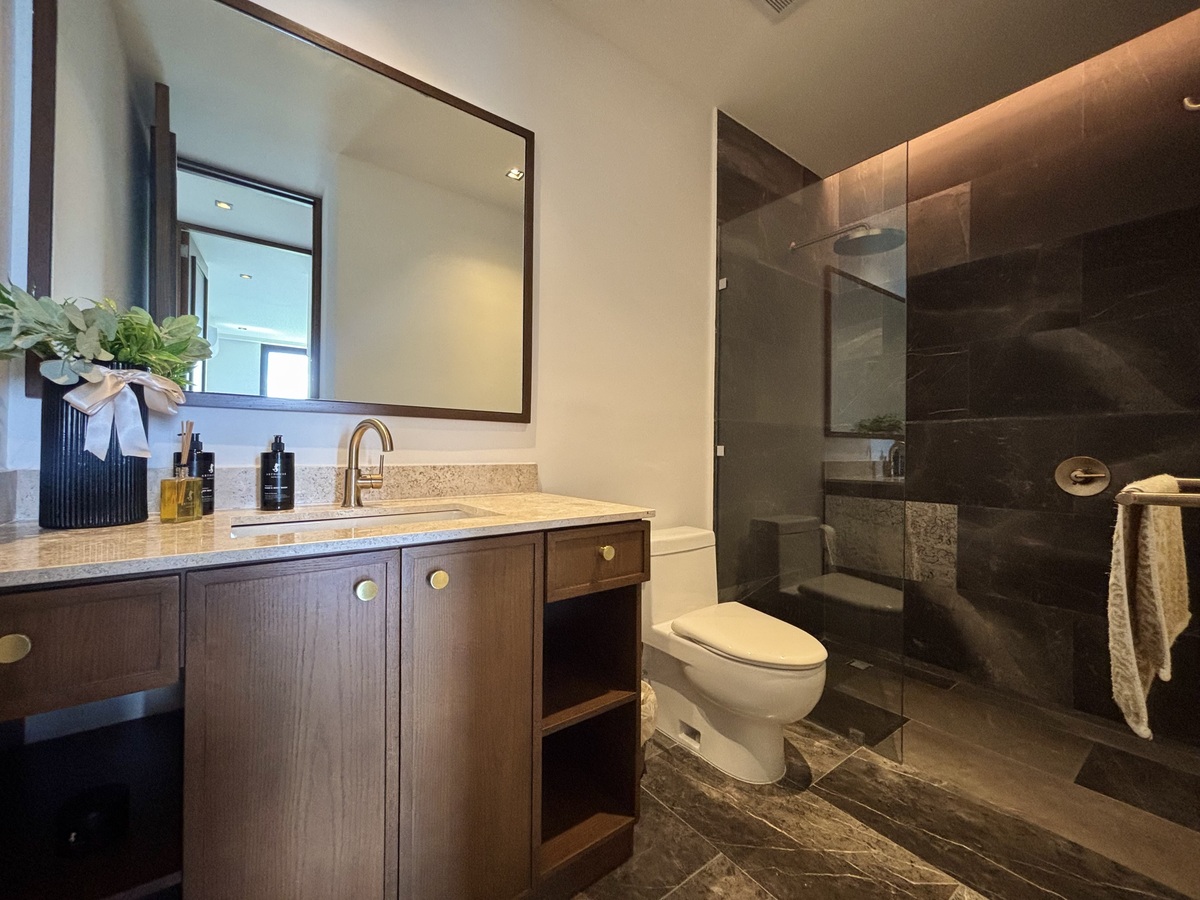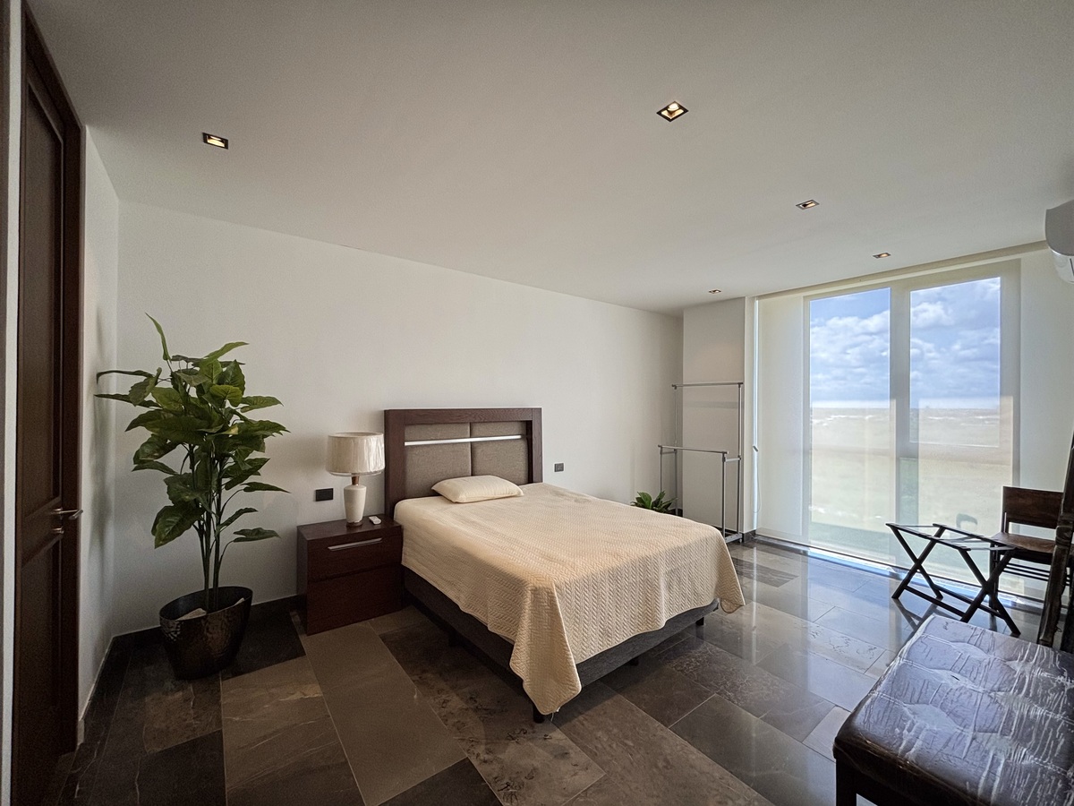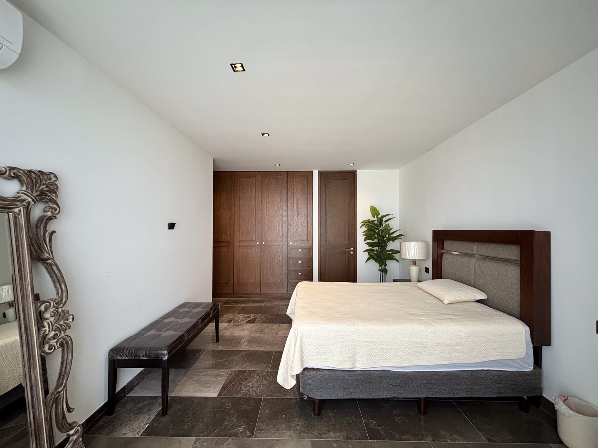 Recámara principal con cama King Size, clóset vestidor equipado y baño completo.