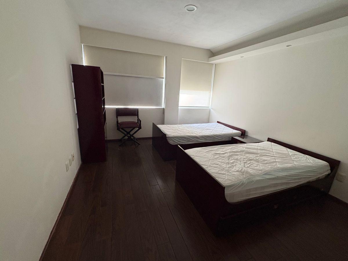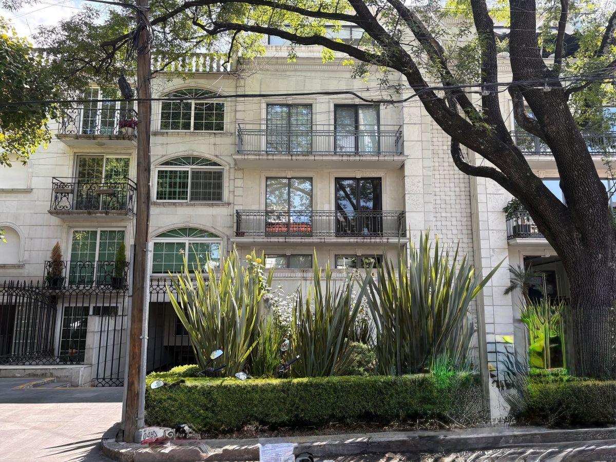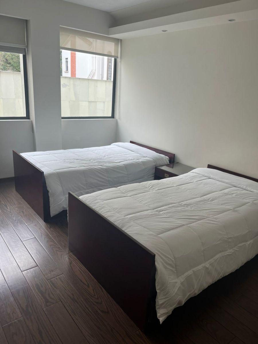 Excelente departamento de estilo francés AMUEBLADO, con magnífica ubicación a una calle de reforma, 190 M2 en una planta elevador al piso, sala, comedor, balcón, 2 recámaras, las 2 con vestidor y baño completo,la principal con una hermosa terraza, los vestidores con carpintería de alta calidad, cocina integral con barra de granito, refrigerador, horno , horno de microondas, área de lavado con lavadora y secadora, cuarto de servicio con baño completo, persianas, 3 estacionamientos, vigilancia las 24 hrs, con recepción.