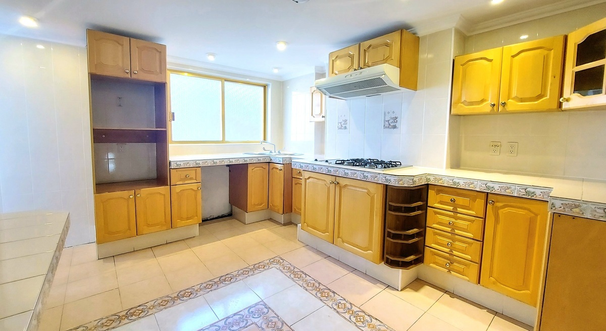 Cocina integral, muy amplia con barra de azulejo, muebles de madera, de gas y eléctrica