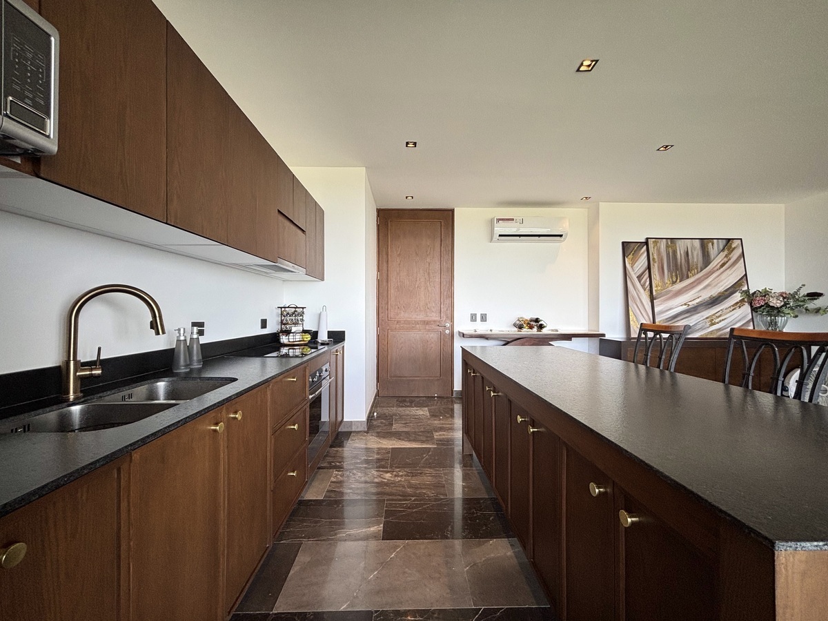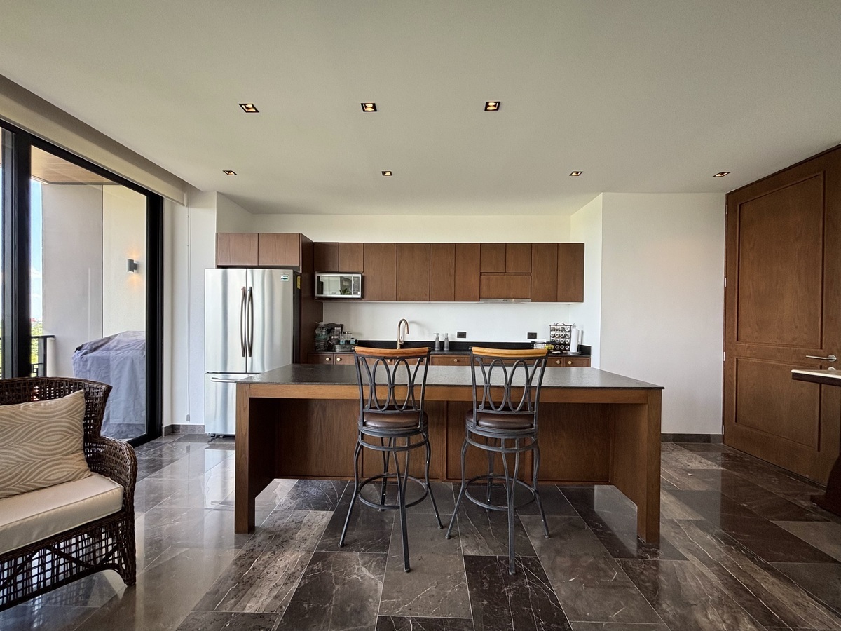 Cocina con isla, horno, parrilla eléctrica, campana, refrigerador de tres puertas y microondas