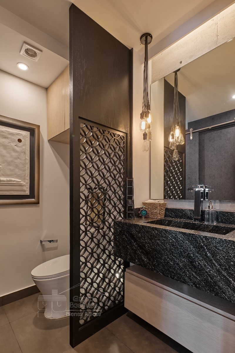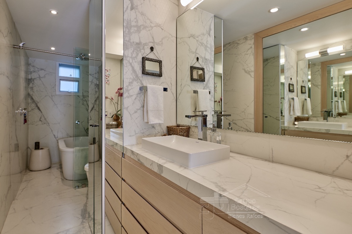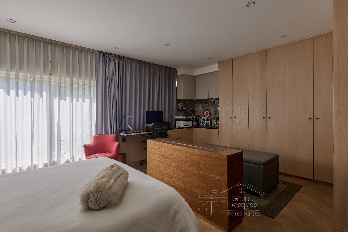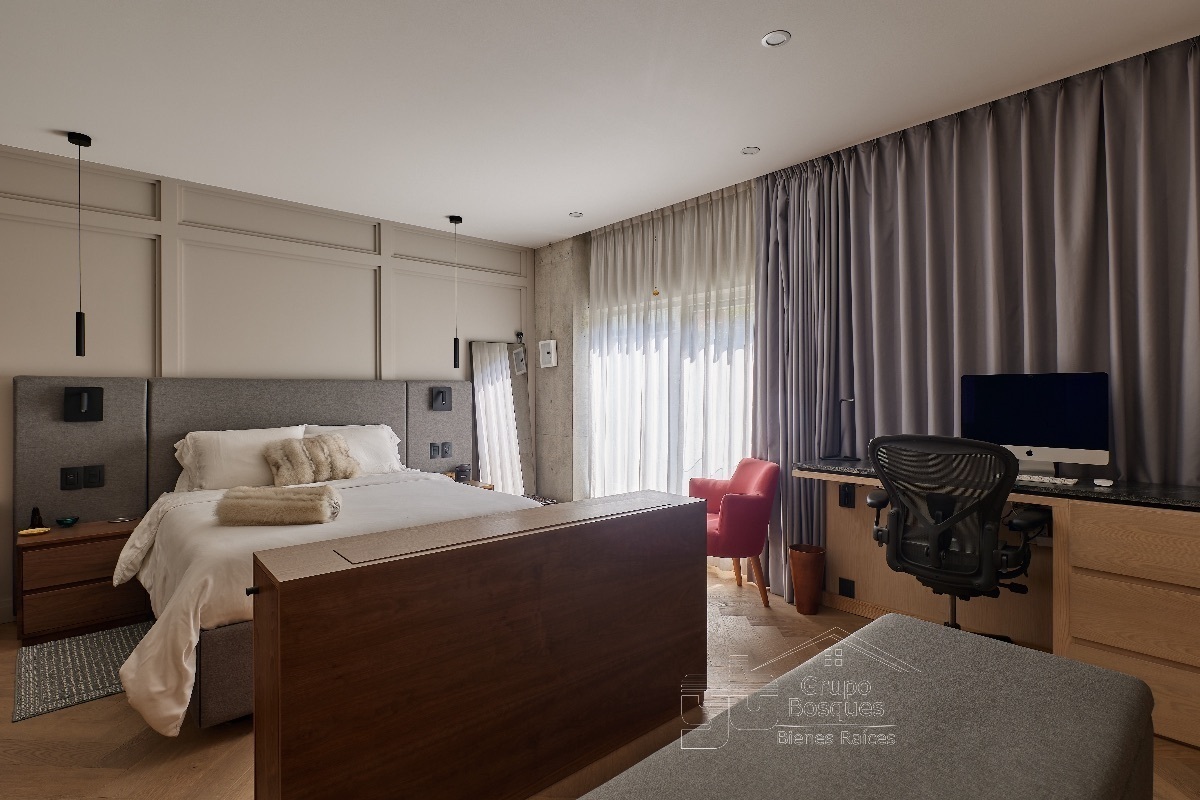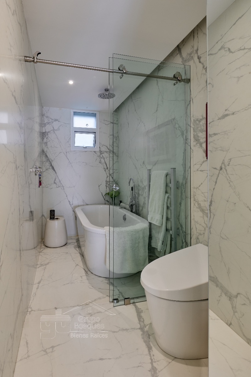 En la planta de arriba esta una amplia recámara muy iluminada, con baño acabado en mármol y canceles de vidrio, clóset grande, pantalla que se oculta cuando no se necesita, vidrios que aíslan el ruido,