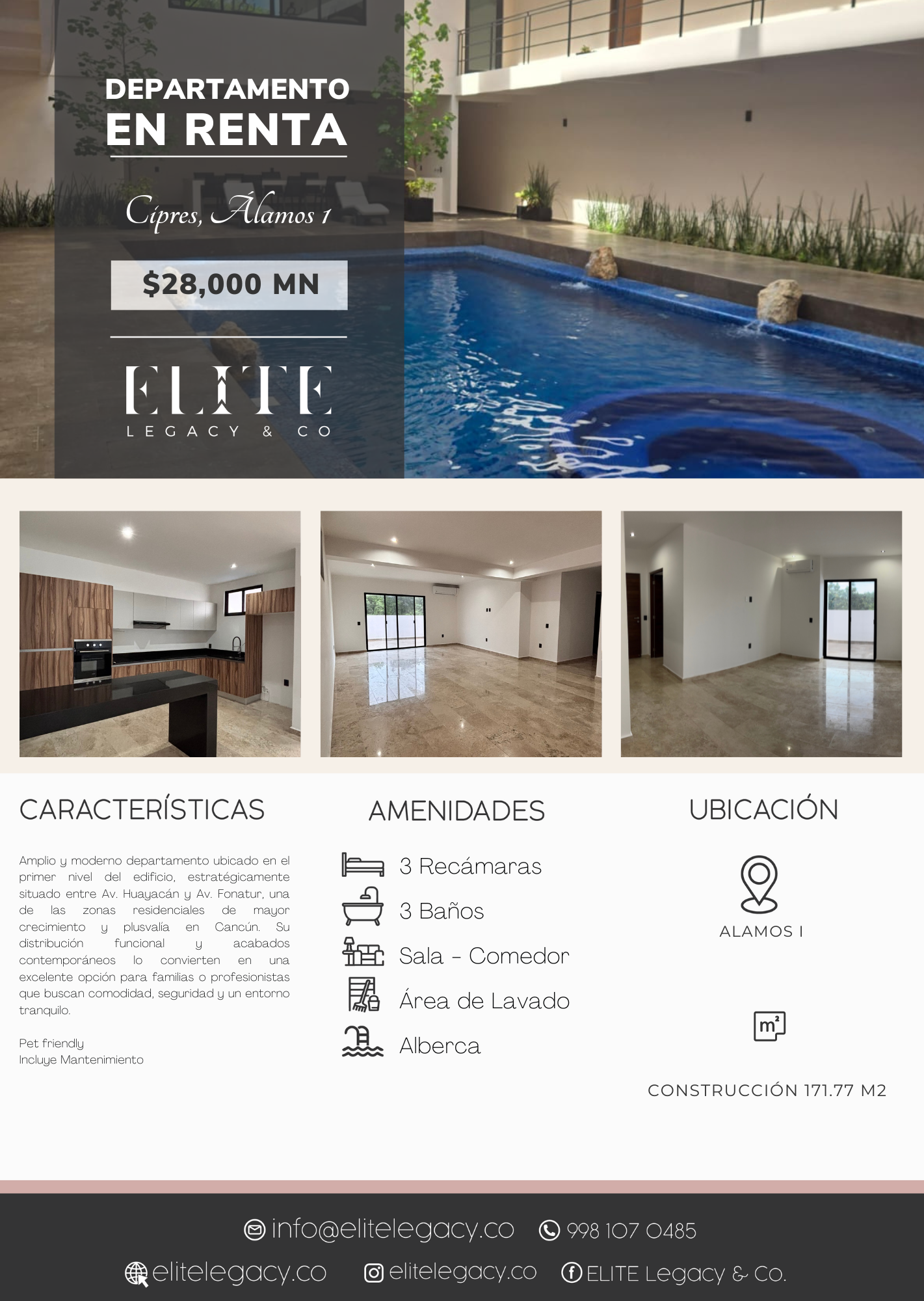 Amplio y moderno departamento ubicado en el primer nivel del edificio, estratégicamente situado entre Av. Huayacán y Av. Fonatur, una de las zonas residenciales de mayor crecimiento y plusvalía en Cancún. Su distribución funcional y acabados contemporáneos lo convierten en una excelente opción para familias o profesionistas que buscan comodidad, seguridad y un entorno tranquilo.