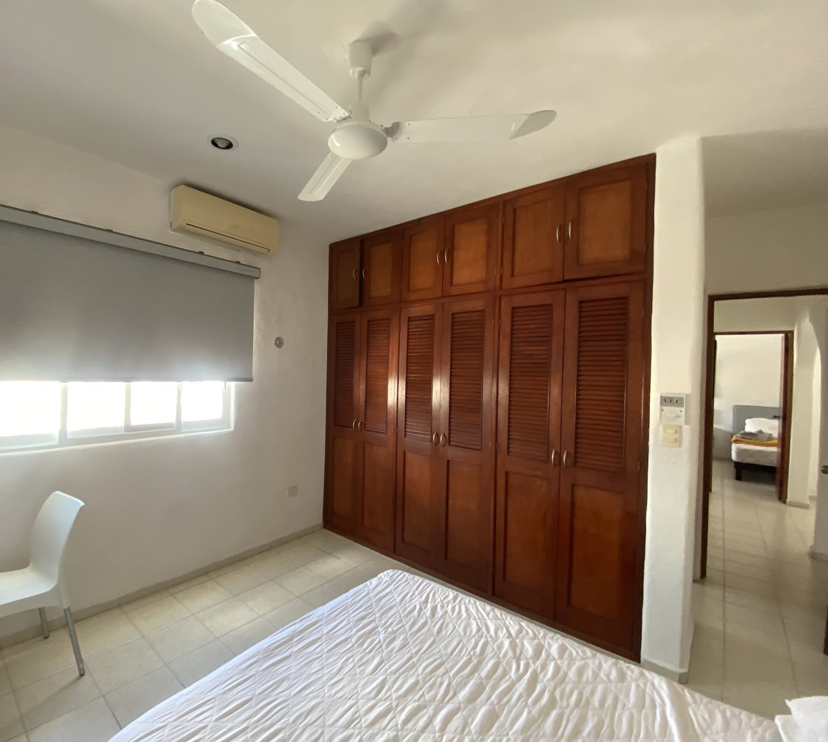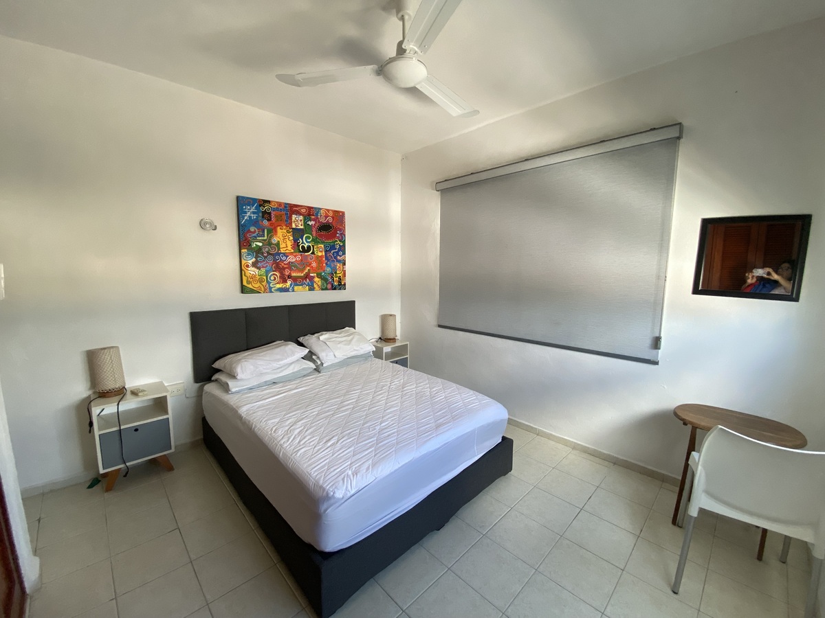 -RECÁMARA 1 CON CAMA QUEEN, AIRE ACONDICIONADO, MESITA DE TRABAJO CON SU SILLA, CLOSET VESTIDO DE PARED, CORTINAS BLACK OUT, Y VENTILADOR.