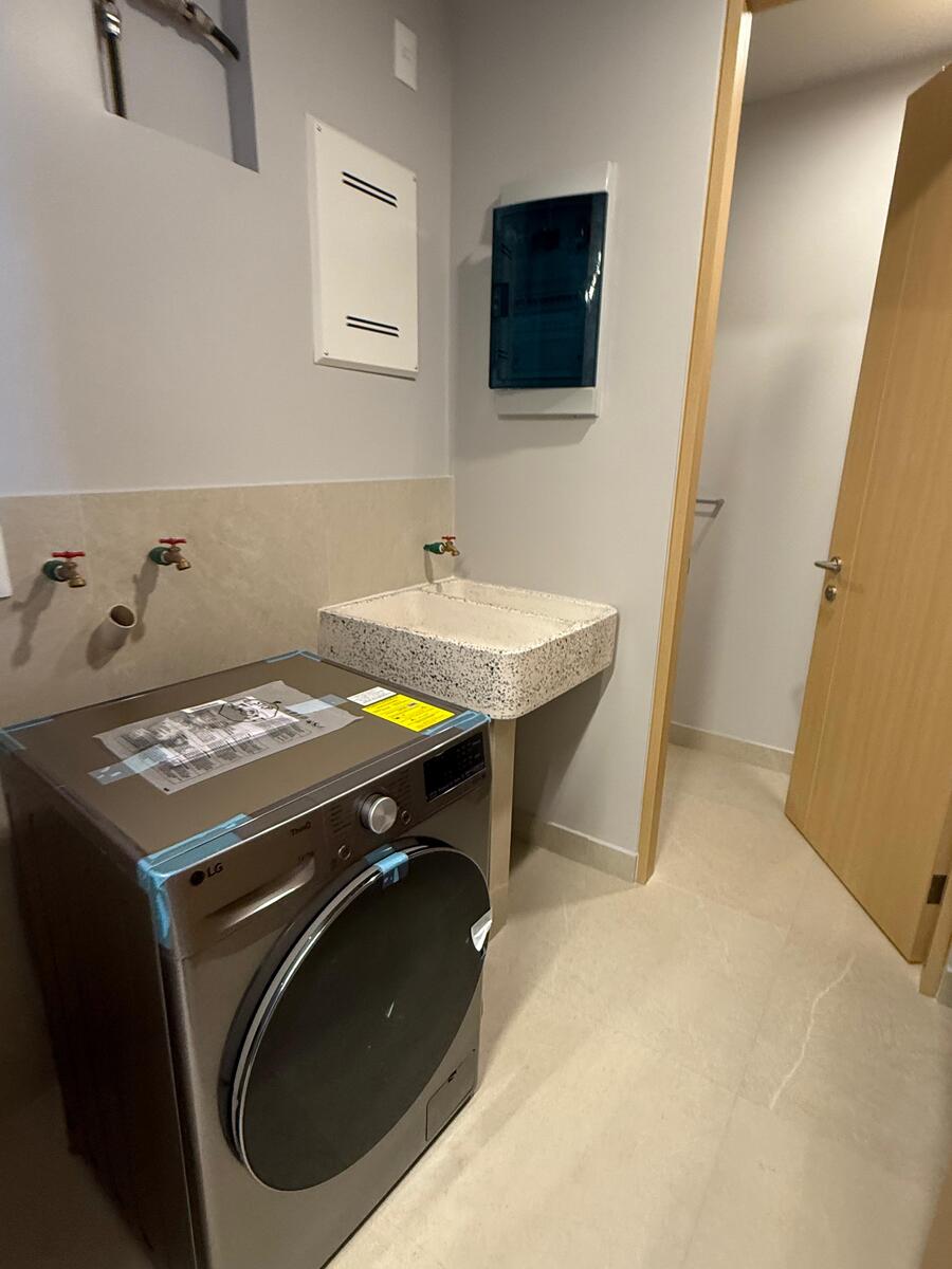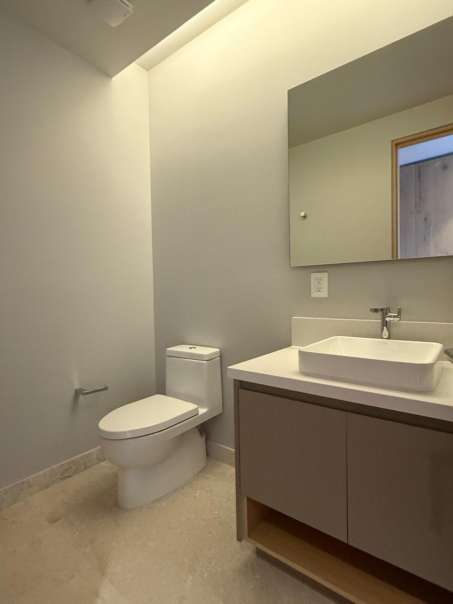 Cuenta con un medio baño de visitas. La cocina equipada con lavavajillas, microhondas, parrilla, campana y distribuida con una barra desayunador permite el acceso a un área de lavado con un medio baño adicional.