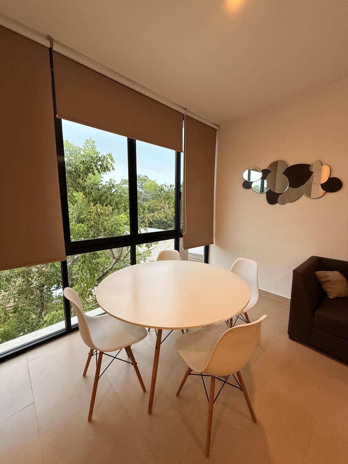 Se renta departamento completamente amueblado en el complejo taiga, ubicado en un de las mejores zonas de merida, en montebello. Cuenta con seguridad y acceso controlado 24h, alberca, bar area social climatizada con television, sofa y mesa.