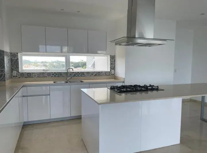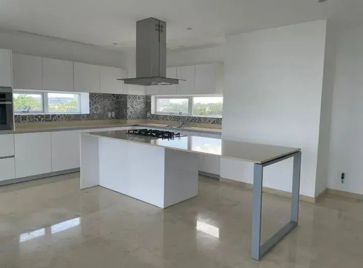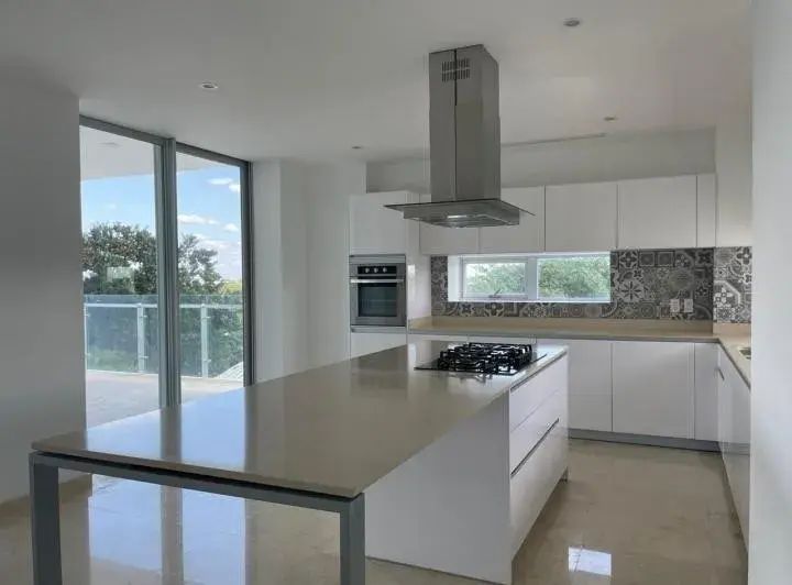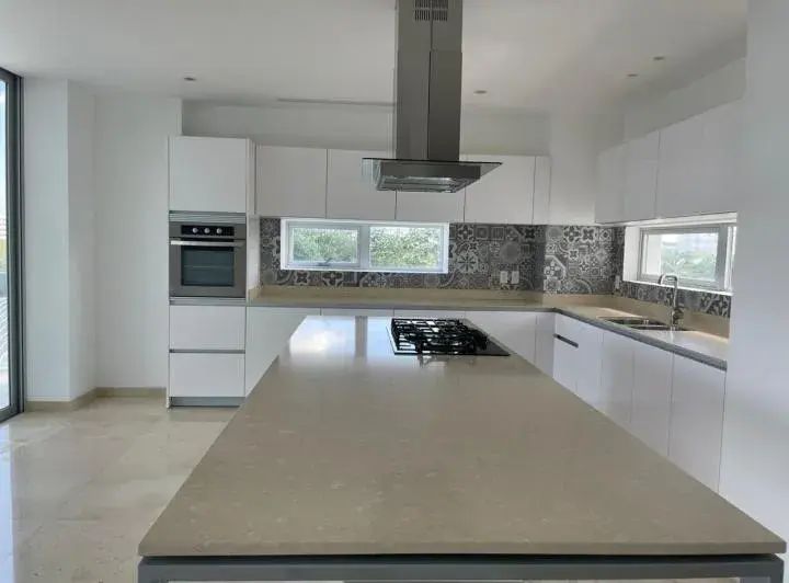 • Amplia Cocina con isla, mesetas de Granito, Estufa y Campana, alacenas y gavetas