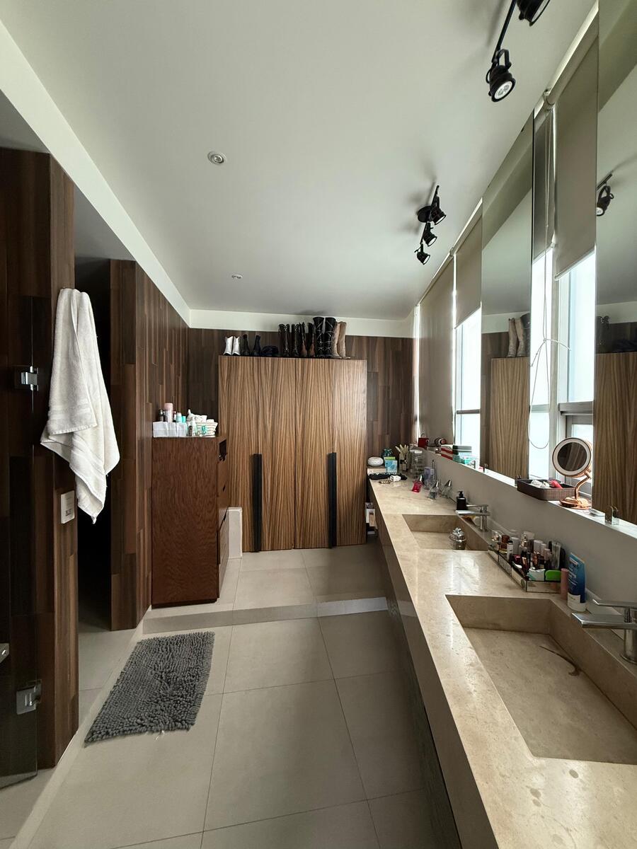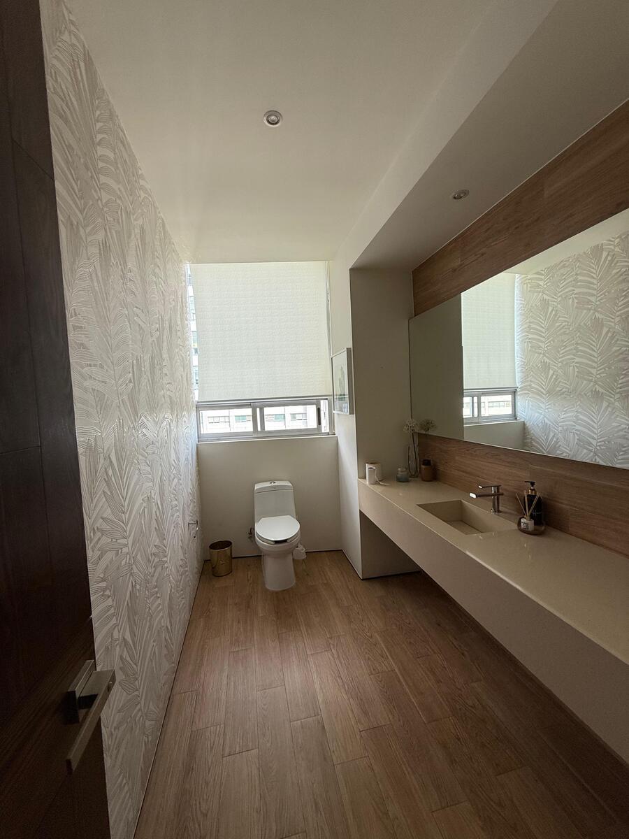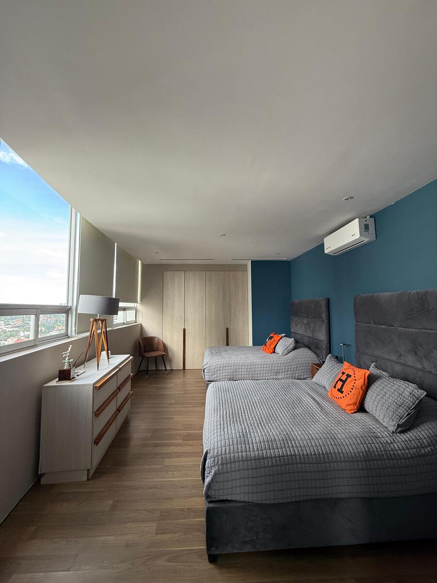 Distribución: 3 recámaras, cada una con vestidor y baño completo, Sala de TV, Estudio / área de home office, Sala y comedor amplios y elegantes, Cocina integral, Baño de visitas, Área social independiente de las recámaras, Cuarto de servicio con baño completo, Cuarto de lavado y clóset de blancos, Persianas instaladas y aire acondicionado en todo el departamento