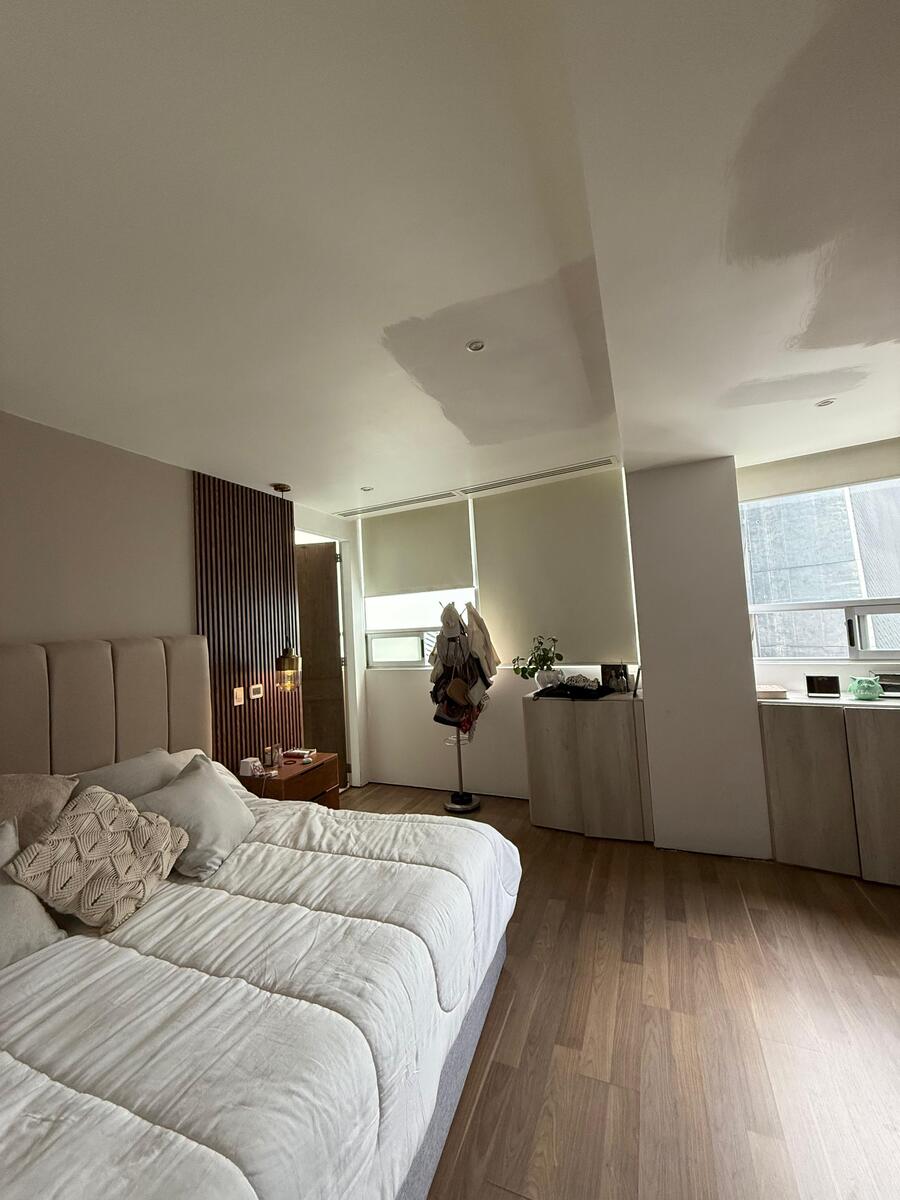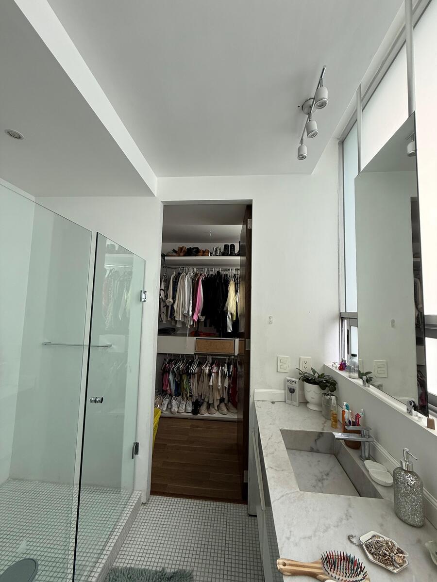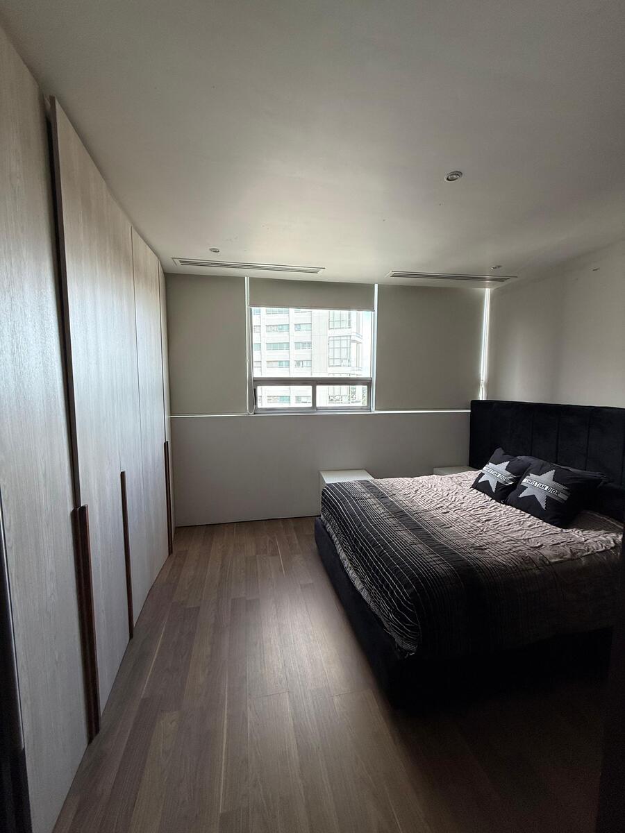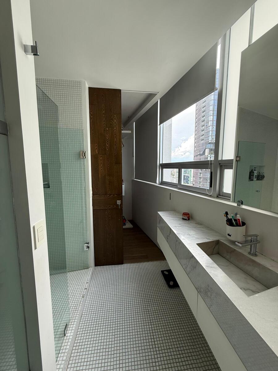 Distribución: 3 recámaras, cada una con vestidor y baño completo, Sala de TV, Estudio / área de home office, Sala y comedor amplios y elegantes, Cocina integral, Baño de visitas, Área social independiente de las recámaras, Cuarto de servicio con baño completo, Cuarto de lavado y clóset de blancos, Persianas instaladas y aire acondicionado en todo el departamento