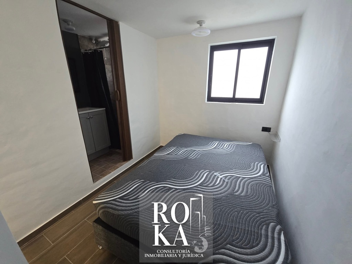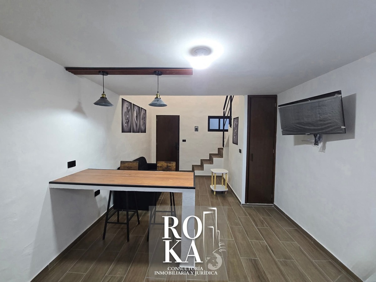 ▪️Primer piso, departamento de dos pisos, con una recámara matrimonial en mezanine, un baño completo, clóset, cocina con barra desayunadora, estancia con sofá y pequeña bodega. Incluye mobiliario en fotos con regadera y parrilla eléctrica, además de servicios de agua e internet. Cámaras de seguridad en el edificio.