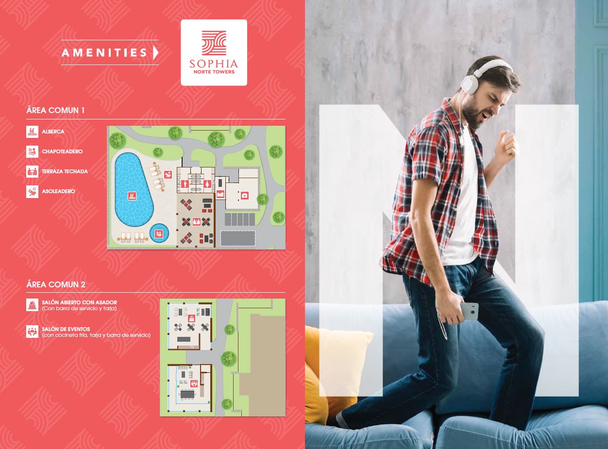 Sophía Norte Towers, además de las amenidades de todo Sophia Distrito cuenta con 6 amenidades propias de Sophia Norte Towers y son Alberca, Chapoteadero, Terraza Techada, Asoleadero, Salón Abierto con Asador (con barra de servicio y tarja), y Salón de Eventos (con cocineta fría, tarja y barra de servicio).