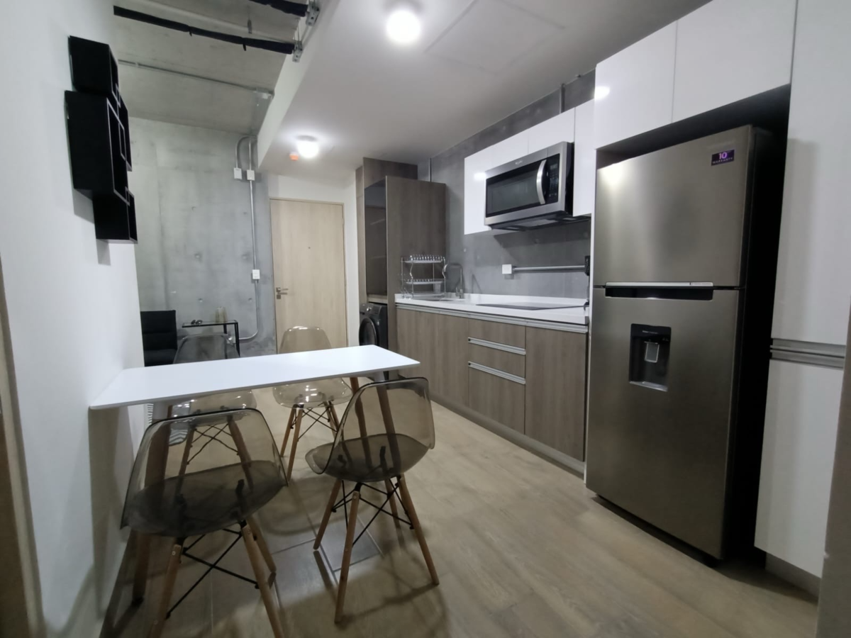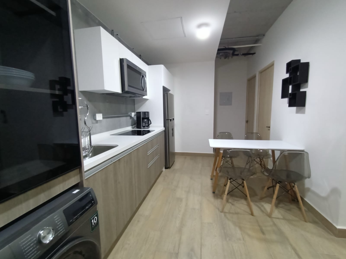 Cocina integral equipada con electrodomésticos (parrilla eléctrica, refrigerador, horno de microondas, cafetera, lava secadora) vajilla, utensilios de cocina.