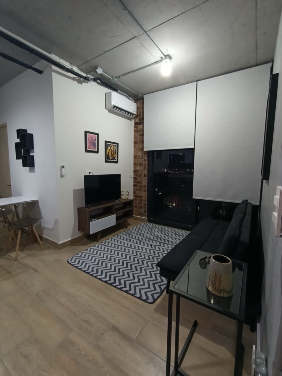 Área social con sofá cama, mueble con televisión, mesa lateral y tapete.