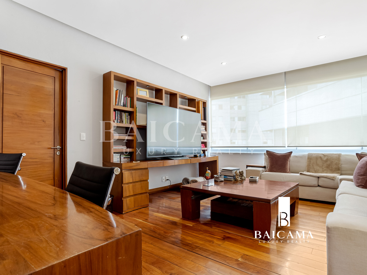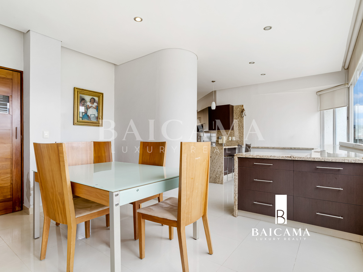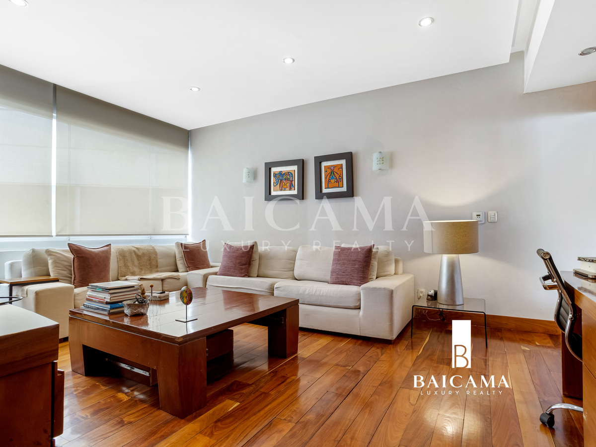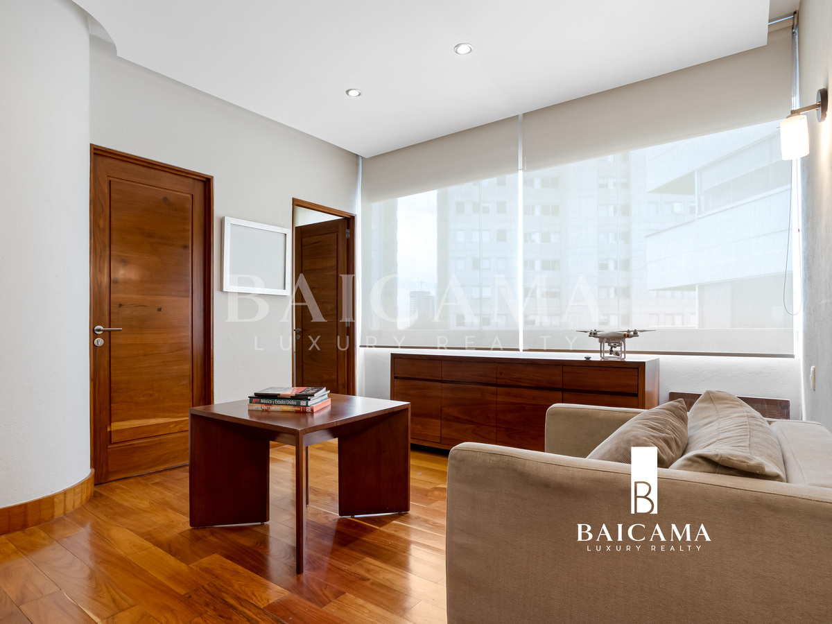 El departamento cuenta con elevador con acceso directo, seguridad 24/7 y control de acceso al fraccionamiento, lo que garantiza privacidad y tranquilidad. Los pisos de madera y acabados de mármol aportan calidez y elegancia, mientras que su distribución abierta permite una excelente iluminación natural en todos los espacios.