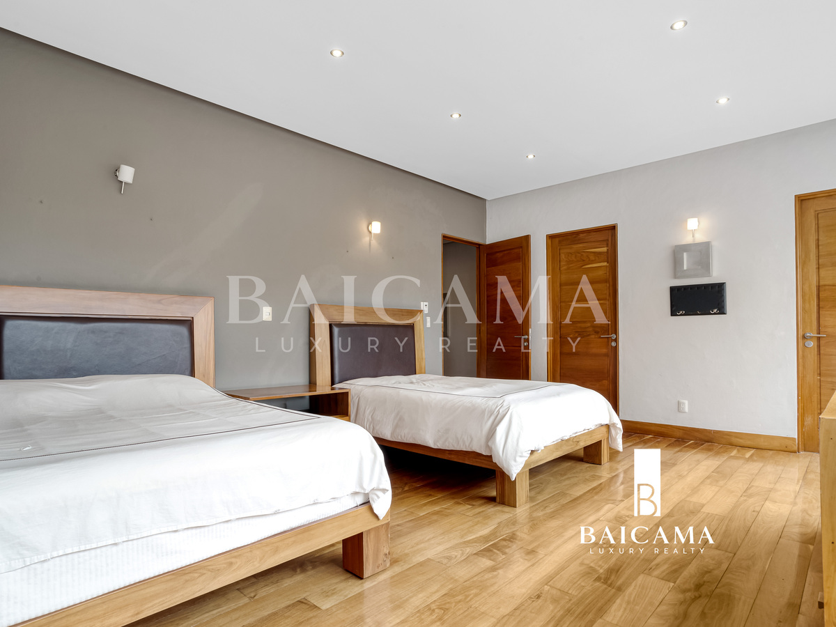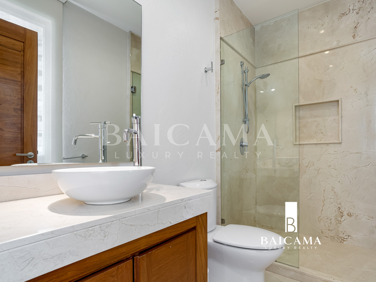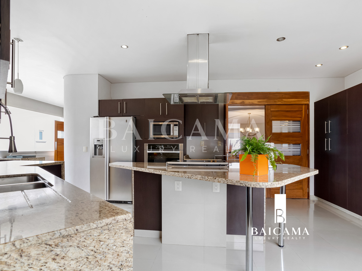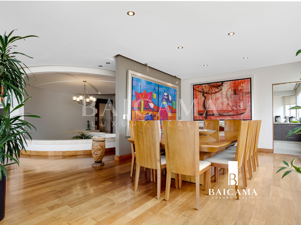 El departamento cuenta con elevador con acceso directo, seguridad 24/7 y control de acceso al fraccionamiento, lo que garantiza privacidad y tranquilidad. Los pisos de madera y acabados de mármol aportan calidez y elegancia, mientras que su distribución abierta permite una excelente iluminación natural en todos los espacios.