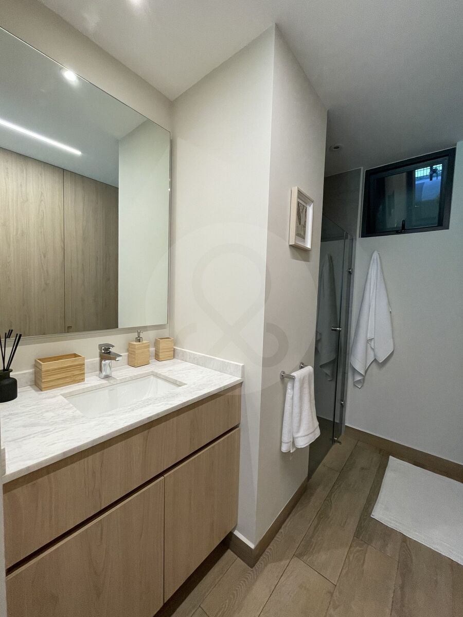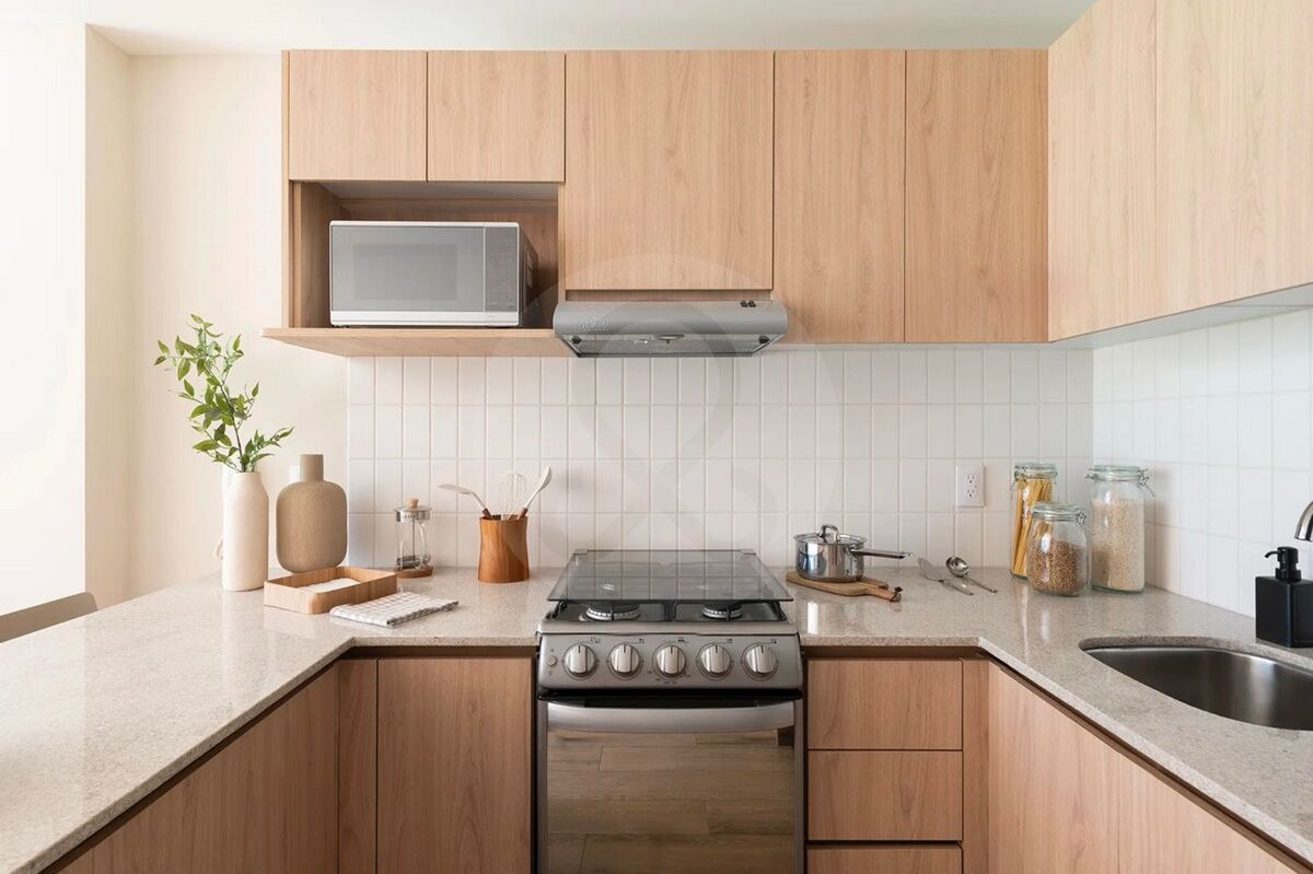 Los departamentos se entregan con closets, cocinas y baños terminados, donde destaca el diseño de vanguardia y acabados de lujo como las cubiertas de granito natural. Se entrega también la cancelería en baños.