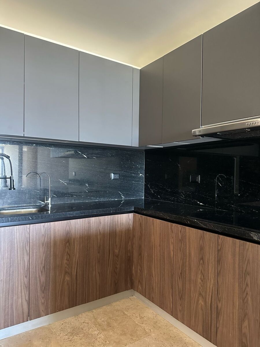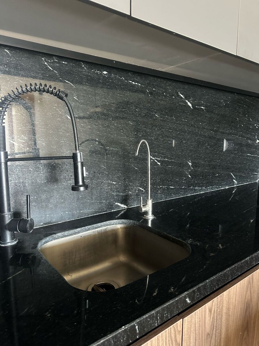 Cocina integral con barra de granito, parrilla eléctrica y purificador de agua