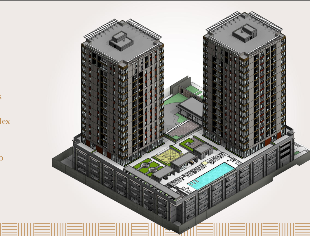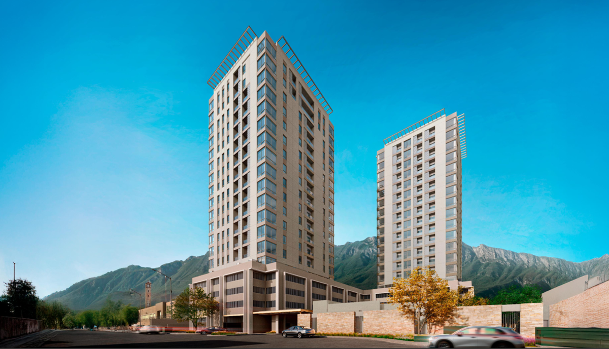 En desarrollo de 2 torres de 20 niveles con un total de 225 departamentos de 1,2 y 3 recámaras más flex y 4 niveles de estacionamiento.