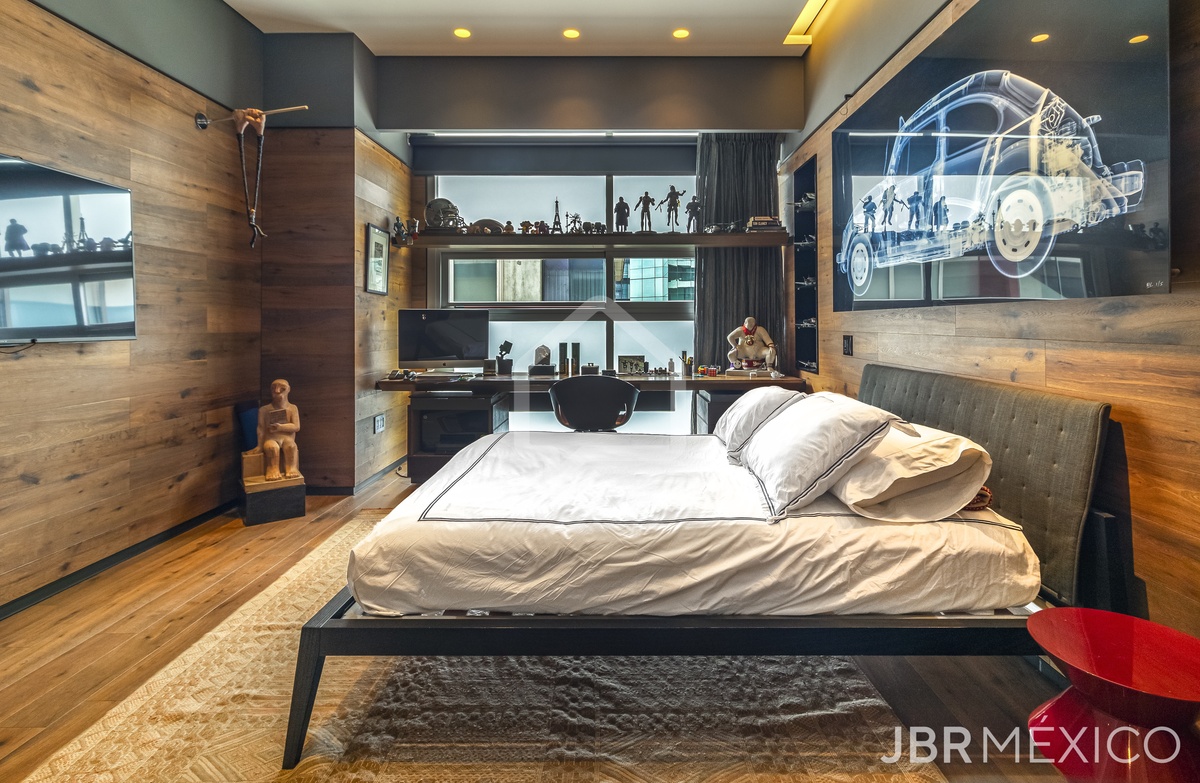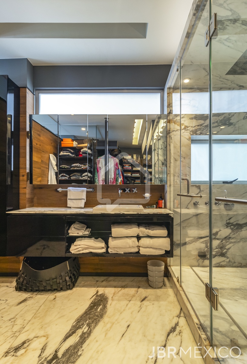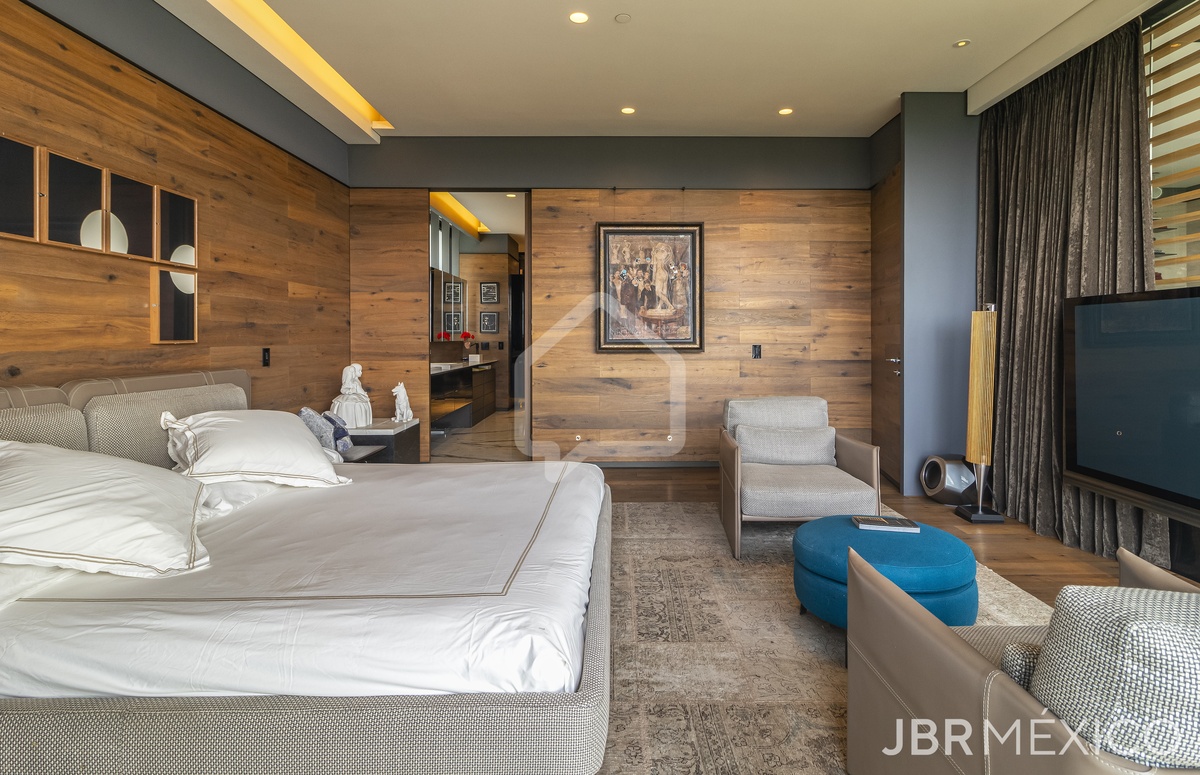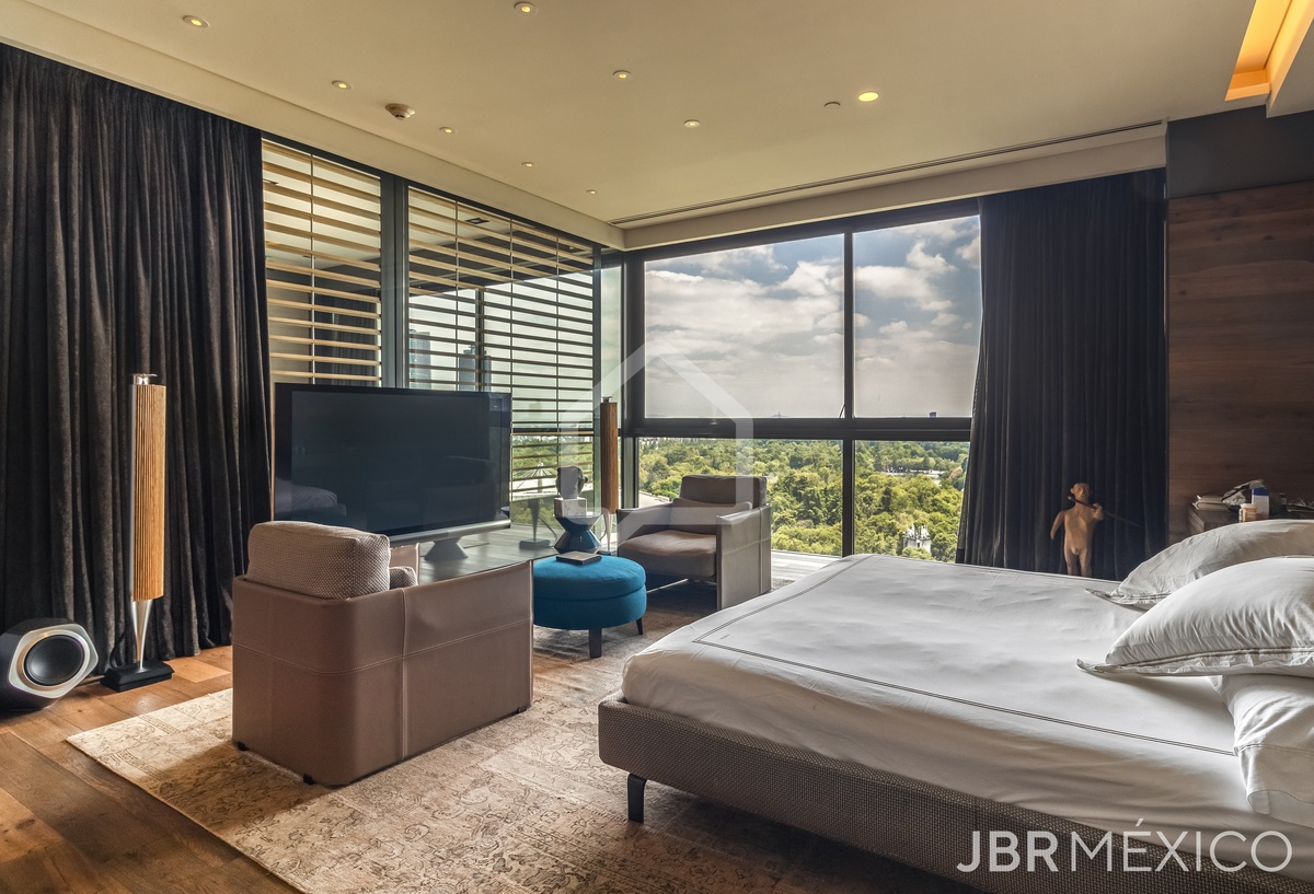 En el piso familiar, la recámara principal ofrece una vista de piso a techo al Bosque de Chapultepec, baño completo con iluminación natural, doble lavamanos y un vestidor independiente con carpintería de alta gama y tecnología de última generación.
