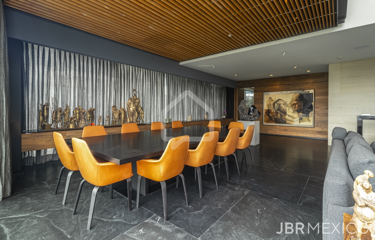 Al entrar al departamento te recibe un diseño moderno y elegante. La sala, con doble altura, se integra de manera natural al balcón y a la vista panorámica al bosque. El comedor, con capacidad para 16 personas, cuenta con un mueble ligero de apoyo y amplio espacio de guardado. La sala tiene además una barra ideal para recibir amigos.