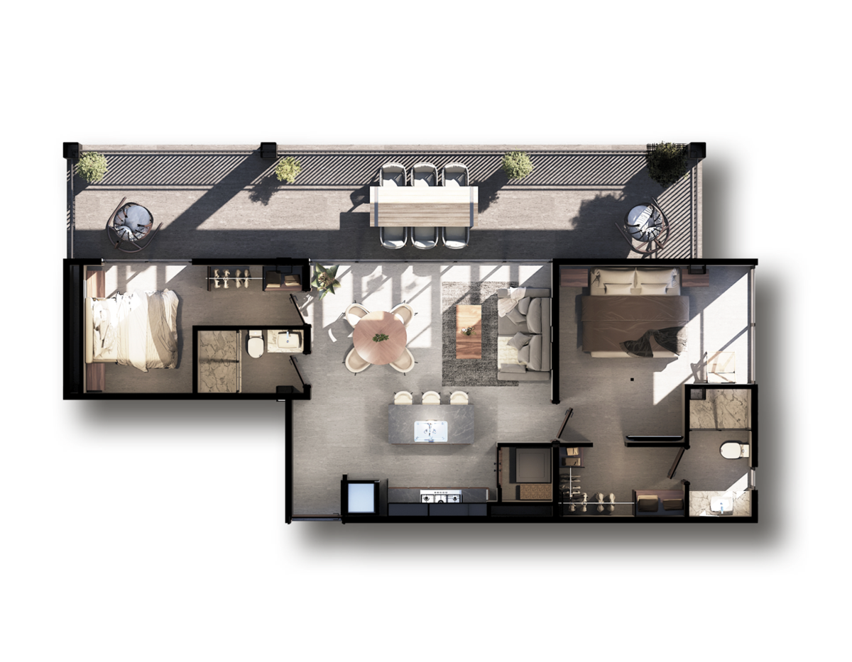 Los acabados incluyen pisos de porcelanato y canceles de baño en cristal templado. El departamento ofrece amenidades como recepción, seguridad 24/7, coworking, terraza con asadores, gimnasio y elevador. Ubicado cerca de servicios esenciales como tiendas, supermercados, escuelas, universidades, bancos y restaurantes. Excelente conectividad: a 8 min de La Minerva, 5 min de Plaza Midtown y Hospital San Javier