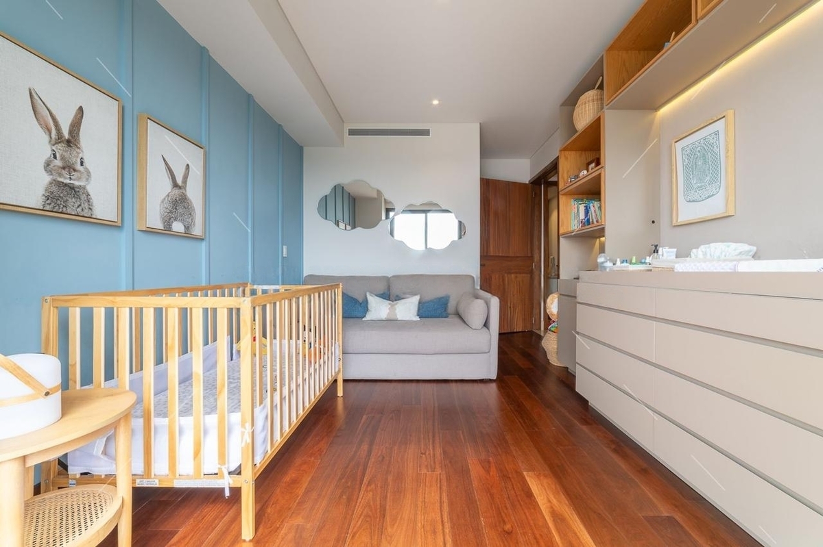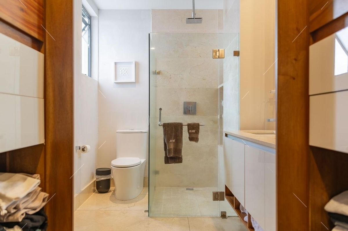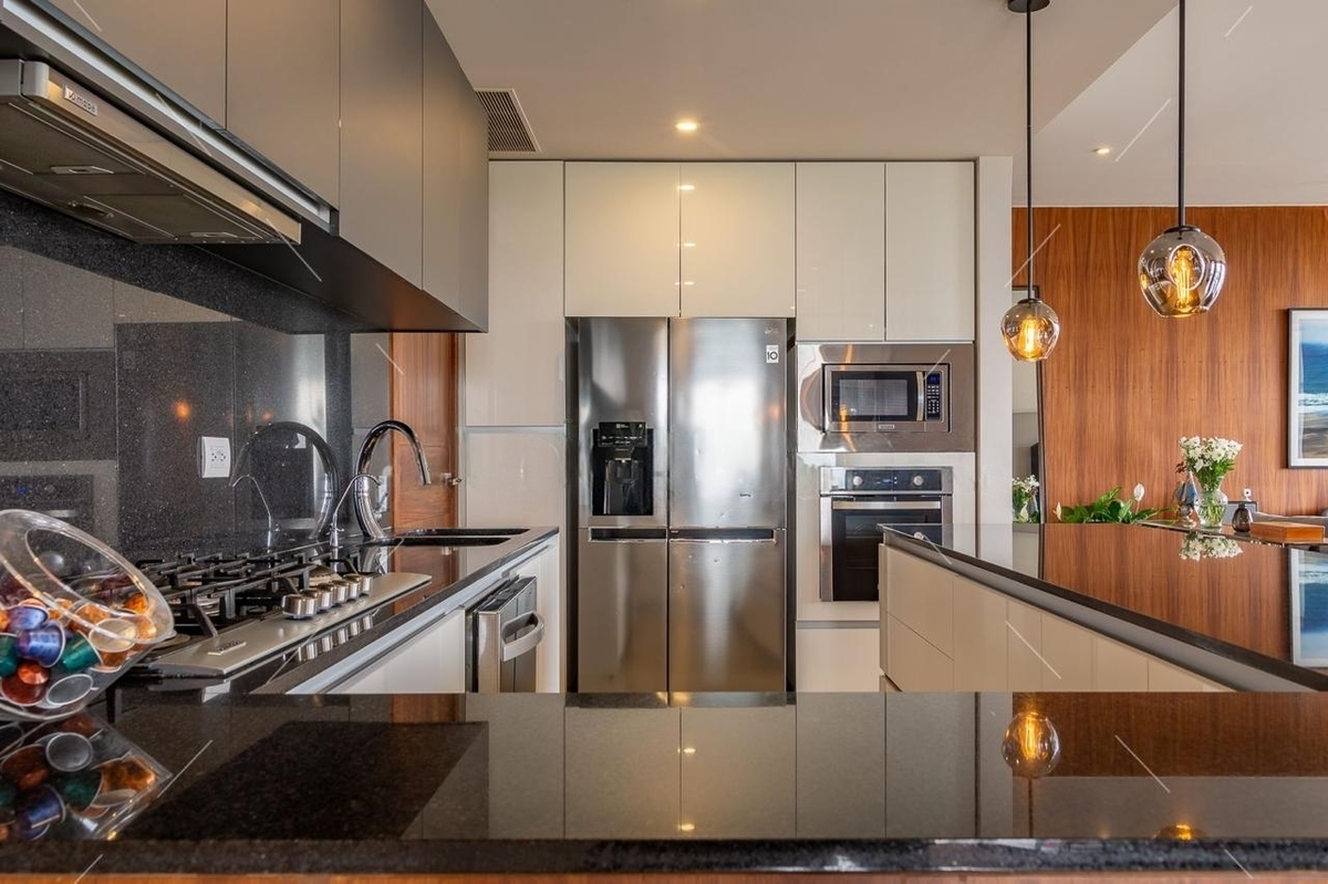 La cocina integral está completamente equipada y cuenta con barra desayunadora. Dispone de tres recámaras, cada una con baño completo y clóset vestidor, brindando confort y privacidad. Además, tiene medio baño para visitas, cuarto de servicio con baño completo y área de lavado.
