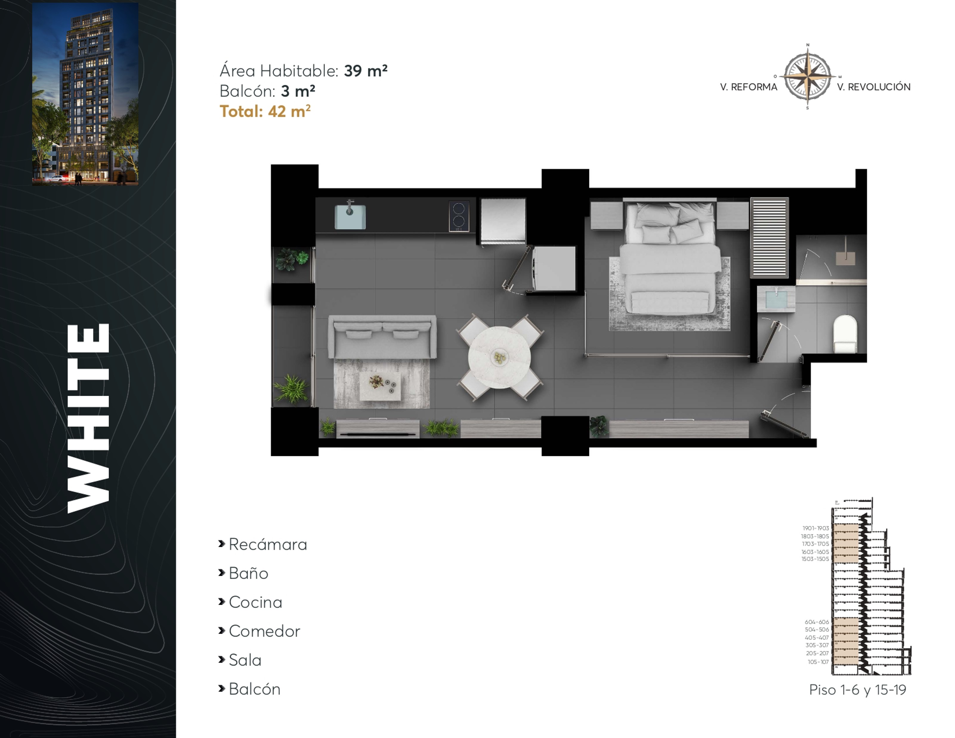 Proyecto de 123 departamentos en 21 niveles, con comercio en planta baja. Departamentos de 1 y 2 recámaras a un costado del Monumento a la Revolución.