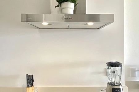 Cocina equipada con meseta de cuarzo blanco, gavetero, parrilla de gas, campana y horno.